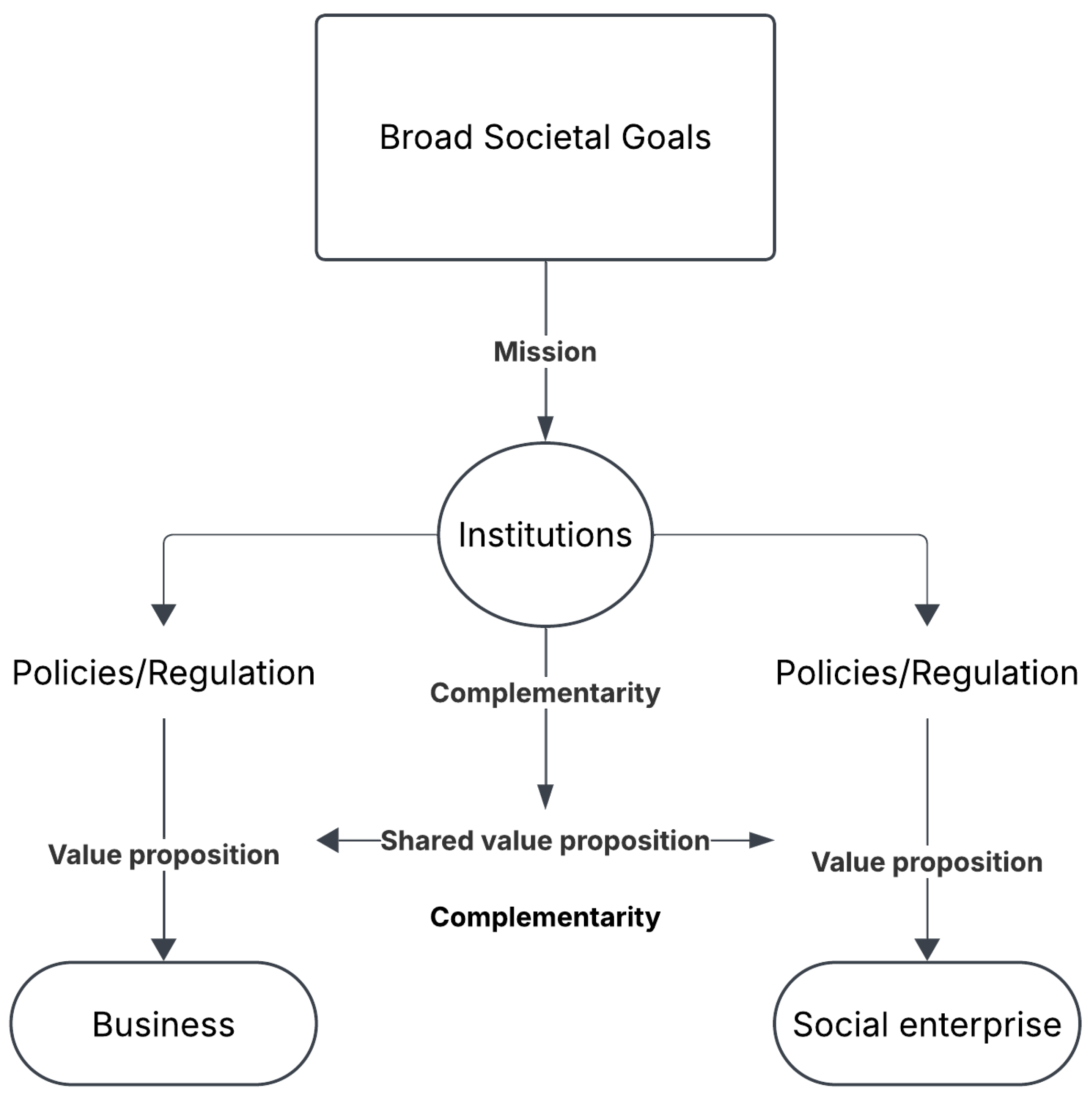 Figure 1 positions the two traditional approaches as connected parts of a single governance chain. At the top, broad social goals represent welfare-orientated goals such as waste reduction, resource security, and inclusion. These objectives are translated into a mission that legitimises the creation or mobilisation of institutions. Institutions sit at the centre as the organising layer: they convert high-level ambitions into concrete policy instruments, regulations, standards, and funding programmes. Through these instruments, institutions shape the room for manoeuvre of both businesses and social enterprises, influencing which circular activities become viable and which remain marginal. In this top down reading, value propositions at the organisational level are partially ‘made’ by the institutional environment, because incentives, compliance requirements, and access to infrastructure define what can be offered, to whom and at what cost.