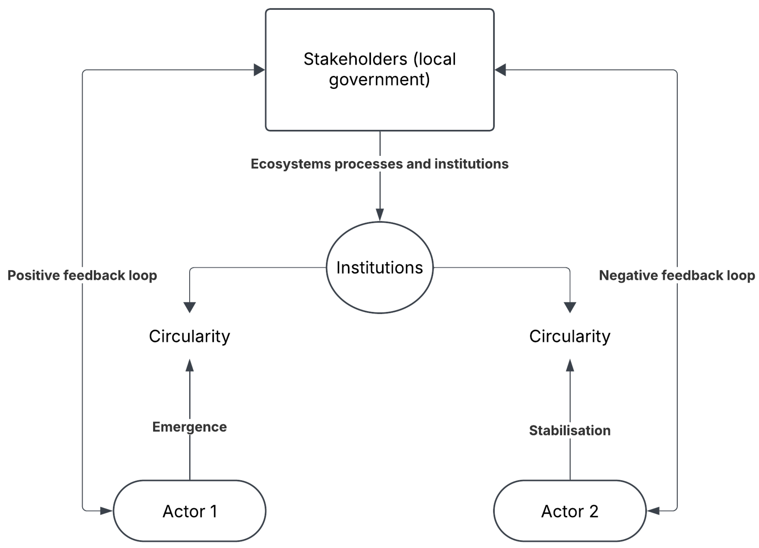 Figure 1, the starting point is a group of stakeholders—often local and regional authorities—who seek to establish the conditions for circular activity. They mobilise resources, convene partners, and create institutional arrangements that provide rules, infrastructures, and legitimacy for firms and social enterprises to experiment with repair, refurbishment, and recycling. What matters here is not only the formal design of institutions but also how stakeholder interactions evolve over time as priorities shift, coalitions form, and learning accumulates. The figure, therefore, shifts attention away from linear cause–and–effect links towards an adaptive process in which policy, firms, and societal actors co-produce trajectories of circularity.