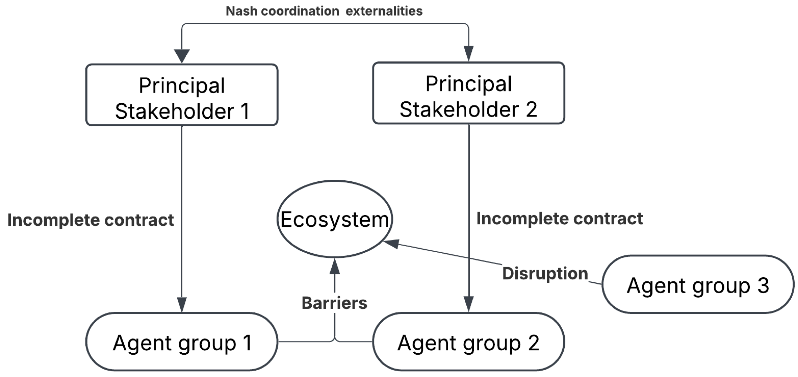 Figure 3 introduces two mechanisms that are easily missed in standard ecosystem accounts. First, barriers between agent groups limit the diffusion of practices and the formation of shared routines, reducing the rate at which local experiments scale into ecosystem capabilities. These barriers may reflect incompatible standards, competition for scarce inputs, or administrative boundaries that prevent knowledge transfer. Second, the figure shows a third group of agents outside the mainstream contracting sphere. Because they are less constrained by established criteria, these outsiders can experiment with alternative technologies, business models, or partnerships, and may disrupt the eco-system from the periphery. This disruption can trigger change by revealing new value propositions or exposing inefficiencies in the incumbent configuration. The common agency lens, therefore, frames ecosystem evolution as a mix of contracting, constrained collaboration, and innovation from outside the dominant system.