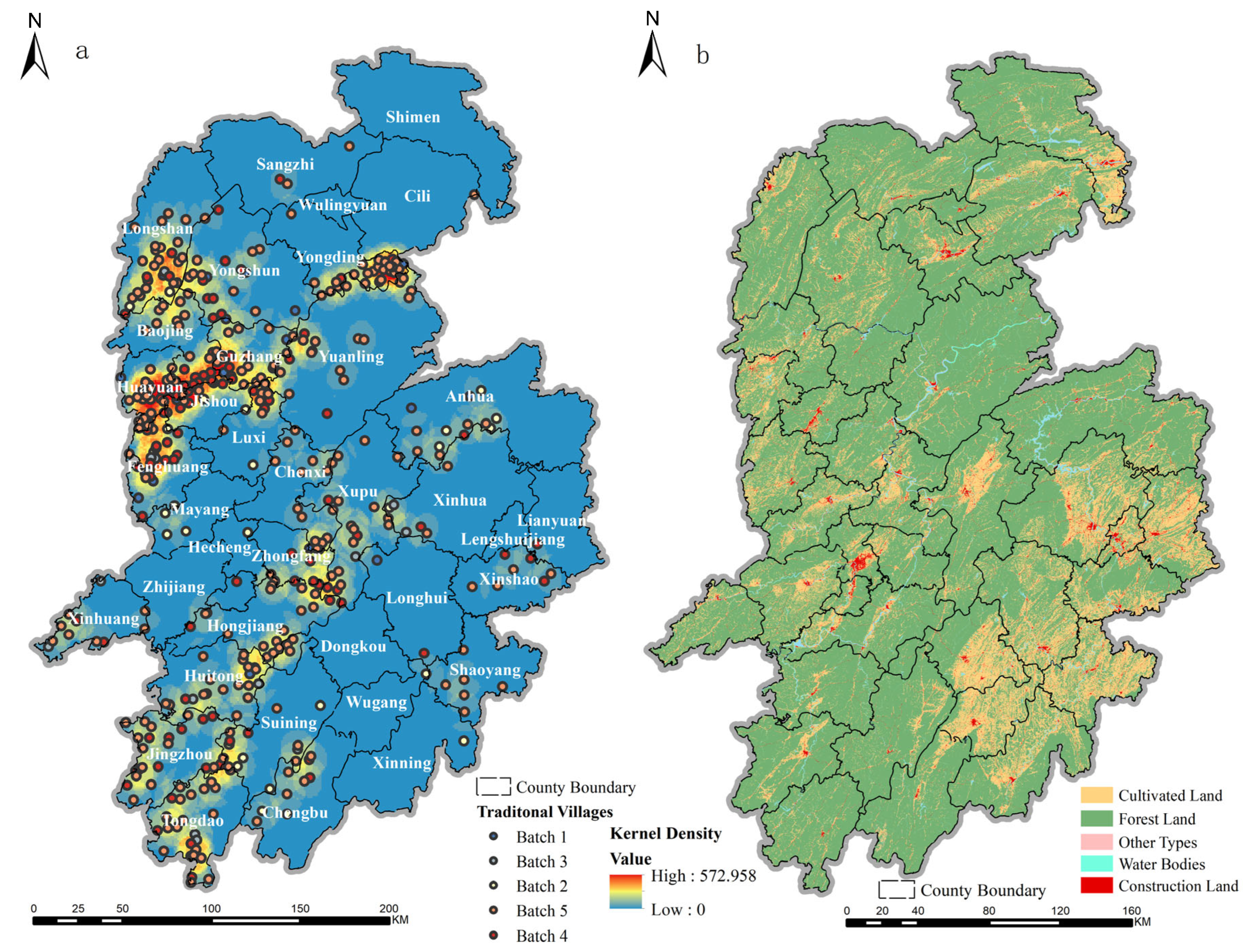- Liu, X.; Yuan, L.; Tan, G. Identification and Hierarchy of Traditional Village Characteristics Based on Concentrated Contiguous Development—Taking 206 Traditional Villages in Hubei Province as an Example. Land 2023, 12, 471. [Google Scholar] [CrossRef]