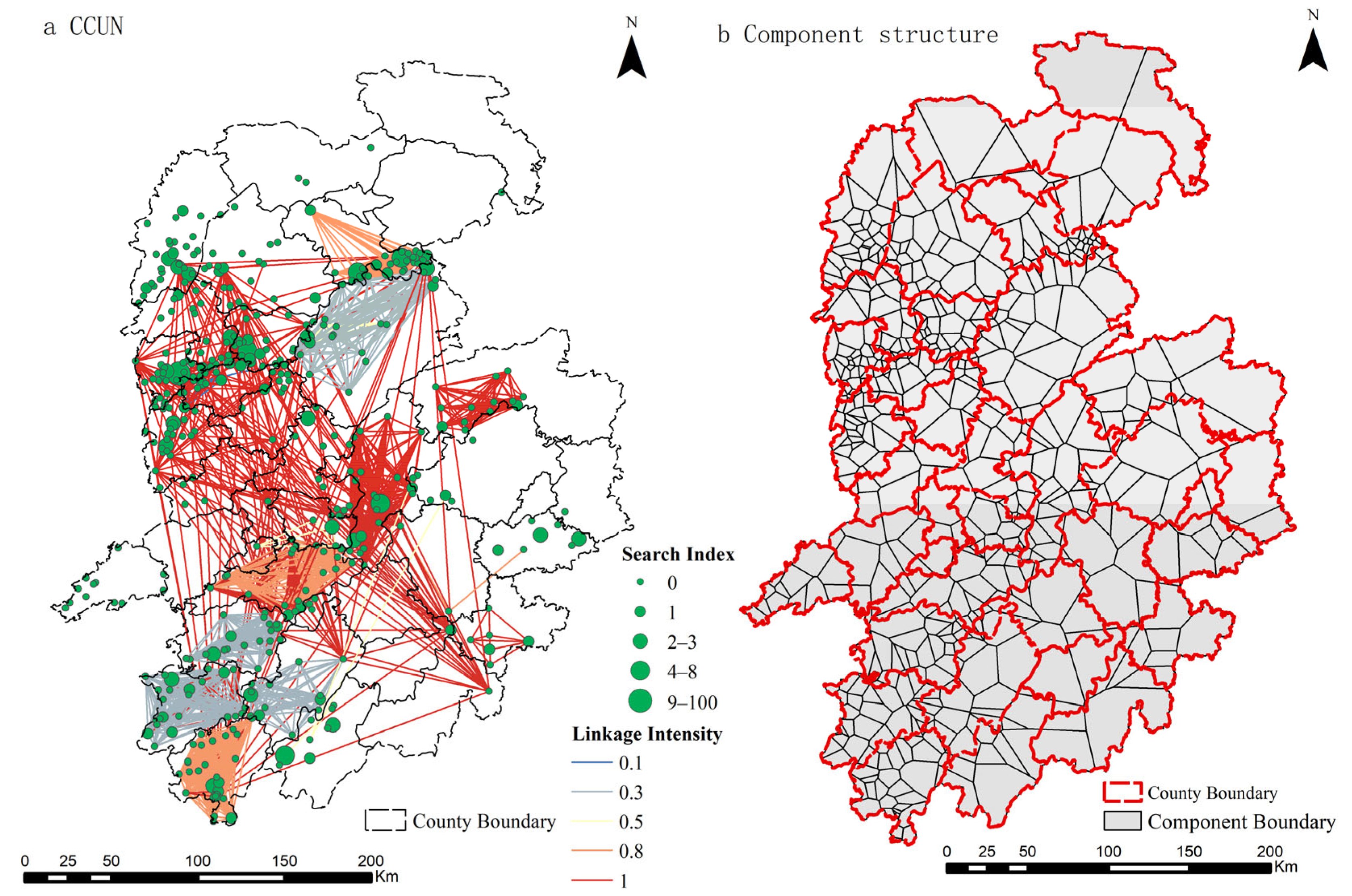 | Socioeconomic Network (SEN) | An undirected weighted network in which traditional villages serve as nodes, and edges represent the potential for socioeconomic connectivity based on the attributes and accessibility between pairs of villages. | Income and population data: Digital Museum of Chinese Traditional Villages (https://www.dmctv.cn) (accessed on 15 November 2024); List of Five Batches data: Ministry of Housing and Urban-Rural Development of the People’s Republic of China (http://www.mohurd.gov.cn) (accessed on 8 June 2024); Baidu search volume data: Baidu Search Resource Platform (https://ziyuan.baidu.com/keywords/index) (accessed on 11 October 2025). | Considering both the attributes and accessibility of traditional villages, the Probability of Connectivity (PC) index from ecology is introduced to assess their potential for socioeconomic connectivity [34]. The attributes of a traditional village include: its designation batch (assigned a weight of 0.5), annual Baidu search volume (0.2), population (0.15), and per capita income (0.15). The attribute data were standardized using min-max normalization, and the attribute weights were determined using the Entropy Weight Method. The comprehensive attribute value for each village was then obtained through weighted synthesis. For accessibility, we employed the direct diffusion probability (Pij) from the SPN framework. Furthermore, the index was modified from an overall network metric to a link-specific indicator () for constructing the socioeconomic network between villages: represents the strength of socioeconomic connections between traditional villages i and j; where ai and aj denote comprehensive attribute values of the villages i and j. amax is the maximum attribute value, and Pij indicates the accessibility between villages. | Are defined by their locational advantages and high development potential. | |