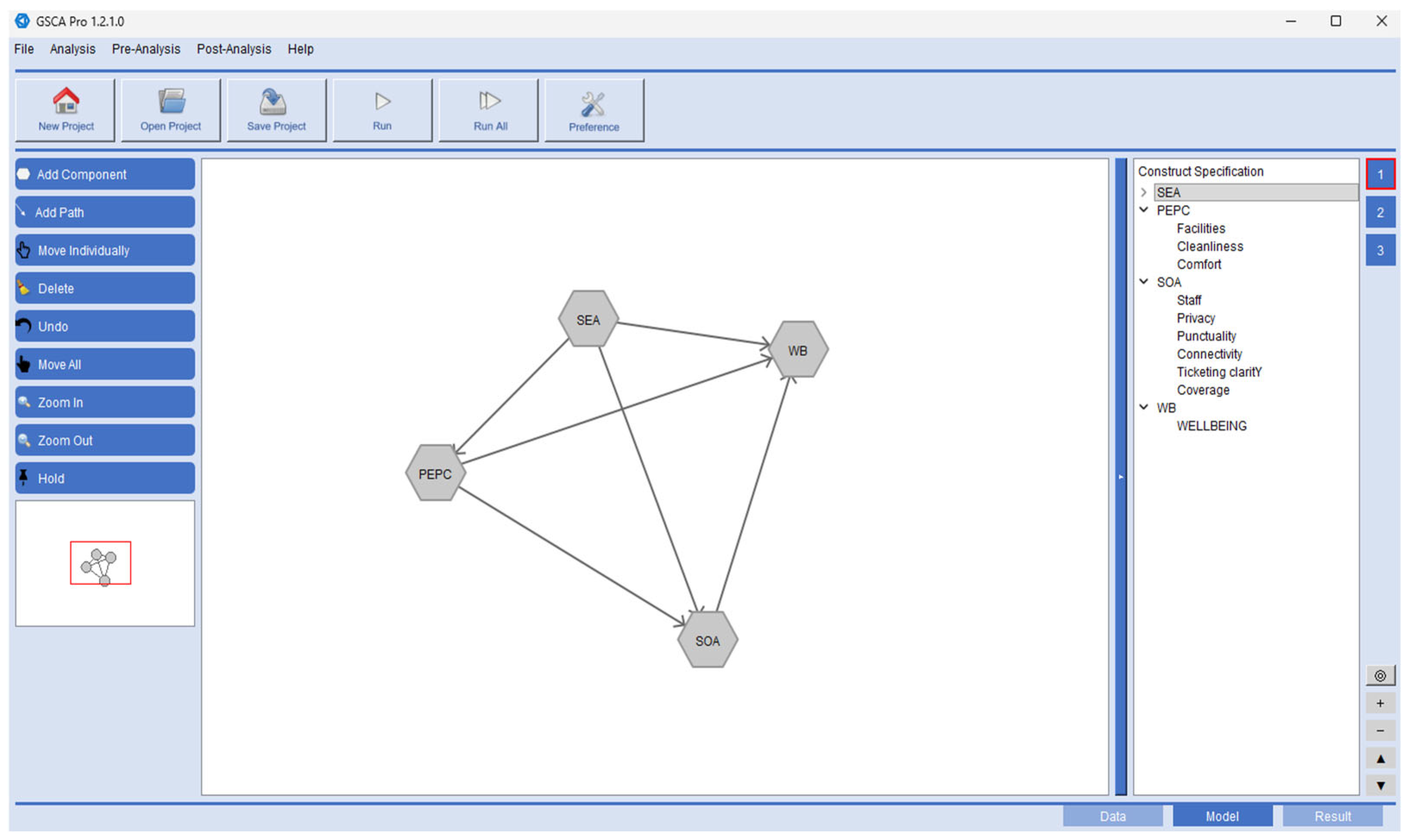 For multicollinearity, The inter-construct correlations show that some latent dimensions move together (e.g., the high SEA-SOA association, r ≈ 0.773), as expected in an integrated metro system where efficient access and operational assurance are jointly experienced (for example, affordability is strongly correlated with speed of service, r = 0.789, and staff professionalism is strongly correlated with connectivity, r = 0.839). Rather than treating this overlap as a fault, it was evaluated whether the shared variance was significant enough to jeopardize the structural results’ stability or interpretability. Collinearity diagnostics revealed a high condition index (82.4), with the highest concentration of shared variation found at the indicator level for privacy (variance proportion = 0.57) and ticketing clarity (variance proportion = 0.91). These specific operational factors appeared to be dependent on one another, but the remaining indicators and constructs met acceptable interpretation criteria. In this context, the GSCA component-based estimation is appropriate because it models constructs as latent composites and estimates their effects concurrently, which helps to accommodate correlated predictors and allows path coefficients to be interpreted as incremental (unique) contributions of each service dimension to wellbeing after accounting for overlap with the other dimensions. As a result, even with a strong SEA-SOA correlation, the model remains useful for prioritization since it distinguishes what is common among service evaluations from what each dimension uniquely explains in rider wellbeing [