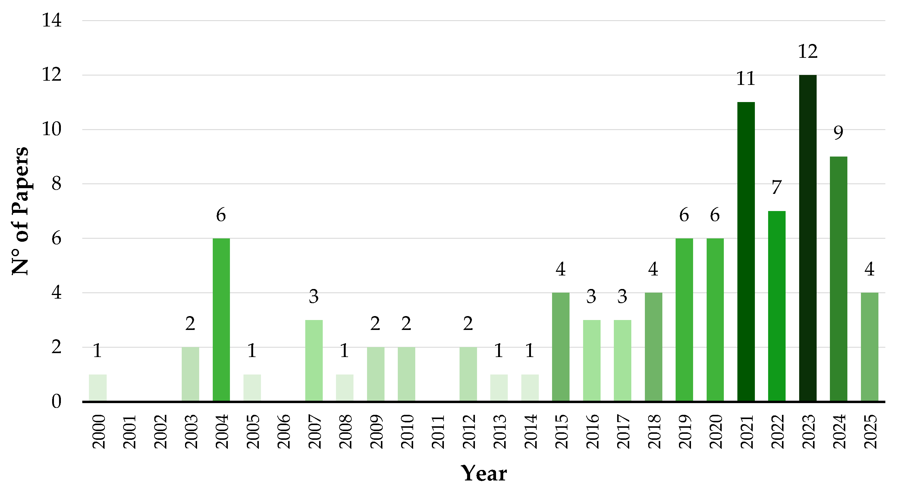 Academic production has grown steadily since the first pioneering studies in the mid-2000s, progressively developing methodologies based on VIs and advanced optical sensors. The growth trend in the number of articles published per year, as highlighted in the graph (