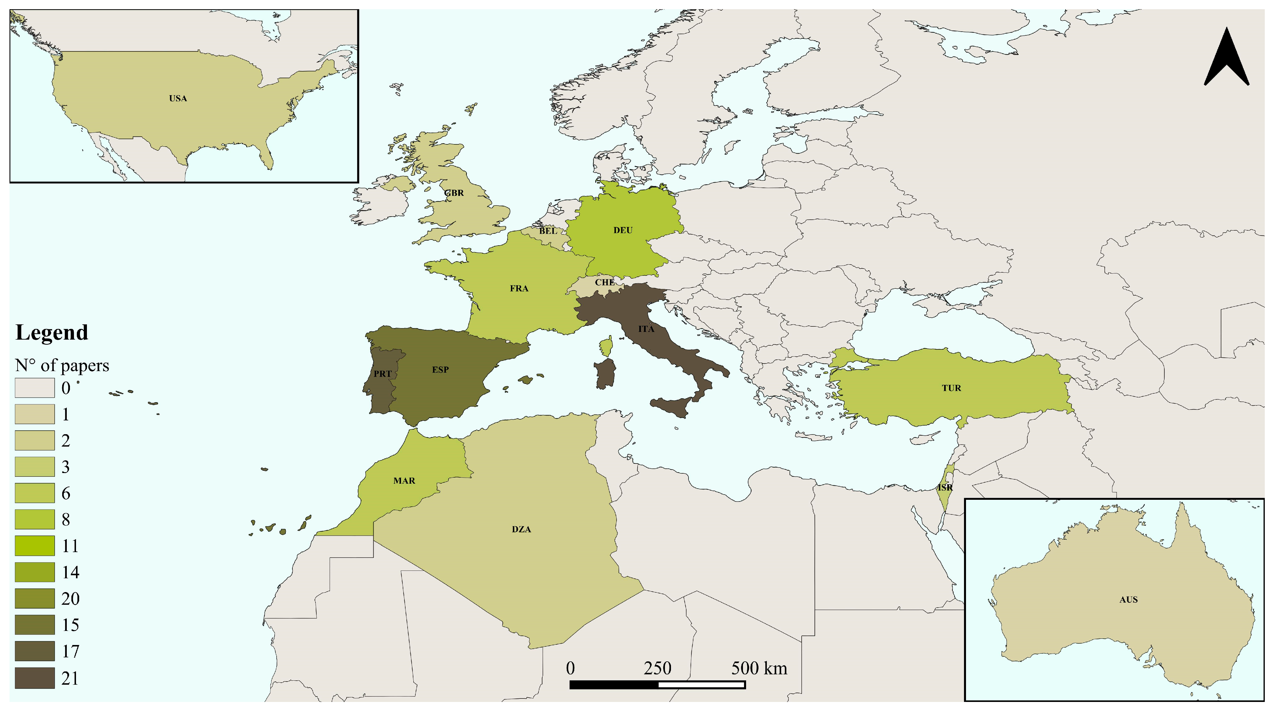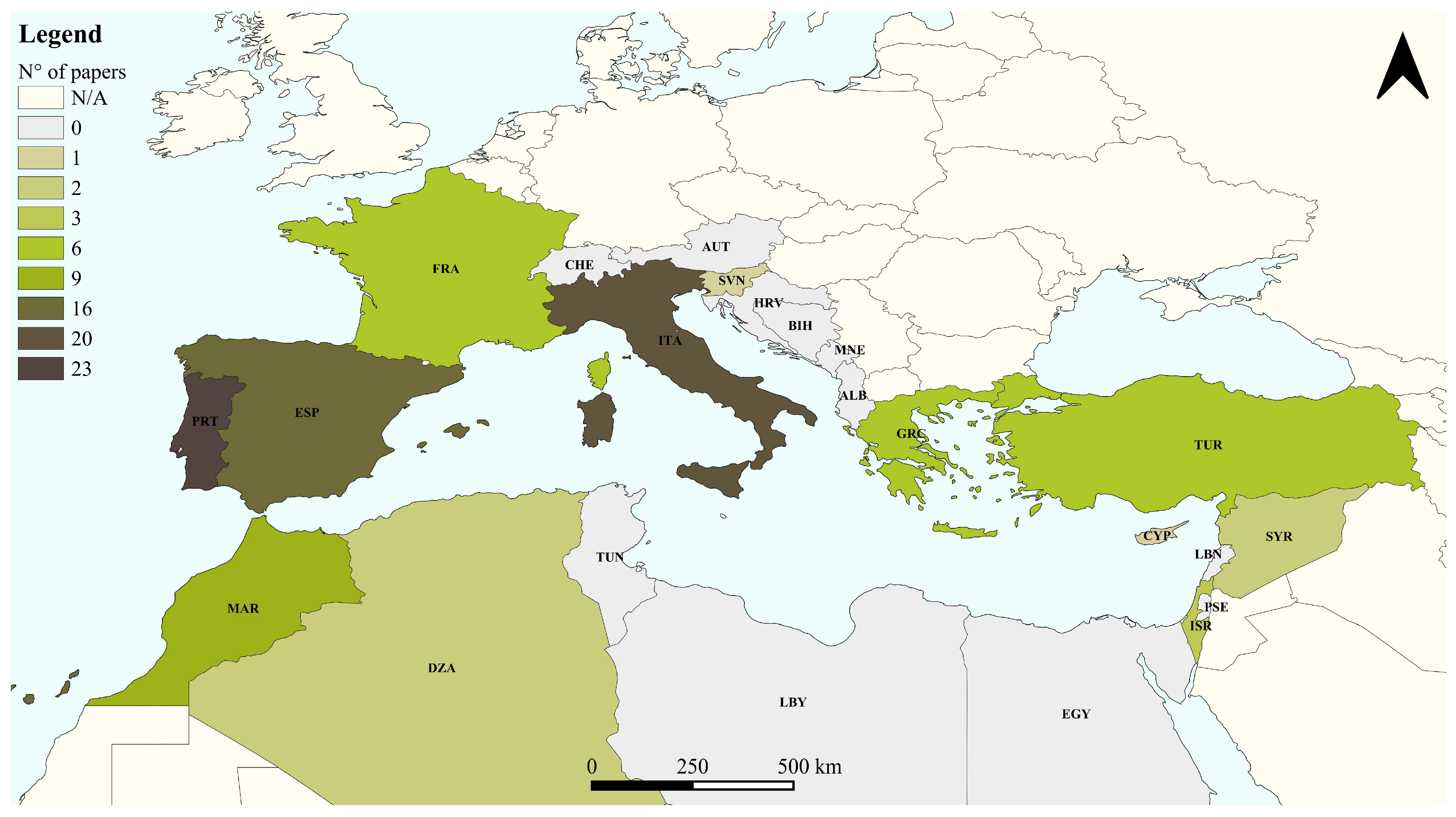 Figure 2) highlights the lack of studies in some Mediterranean countries. The largest number of contributions for single country was detected for areas located in the Italian peninsula with 20 studies [