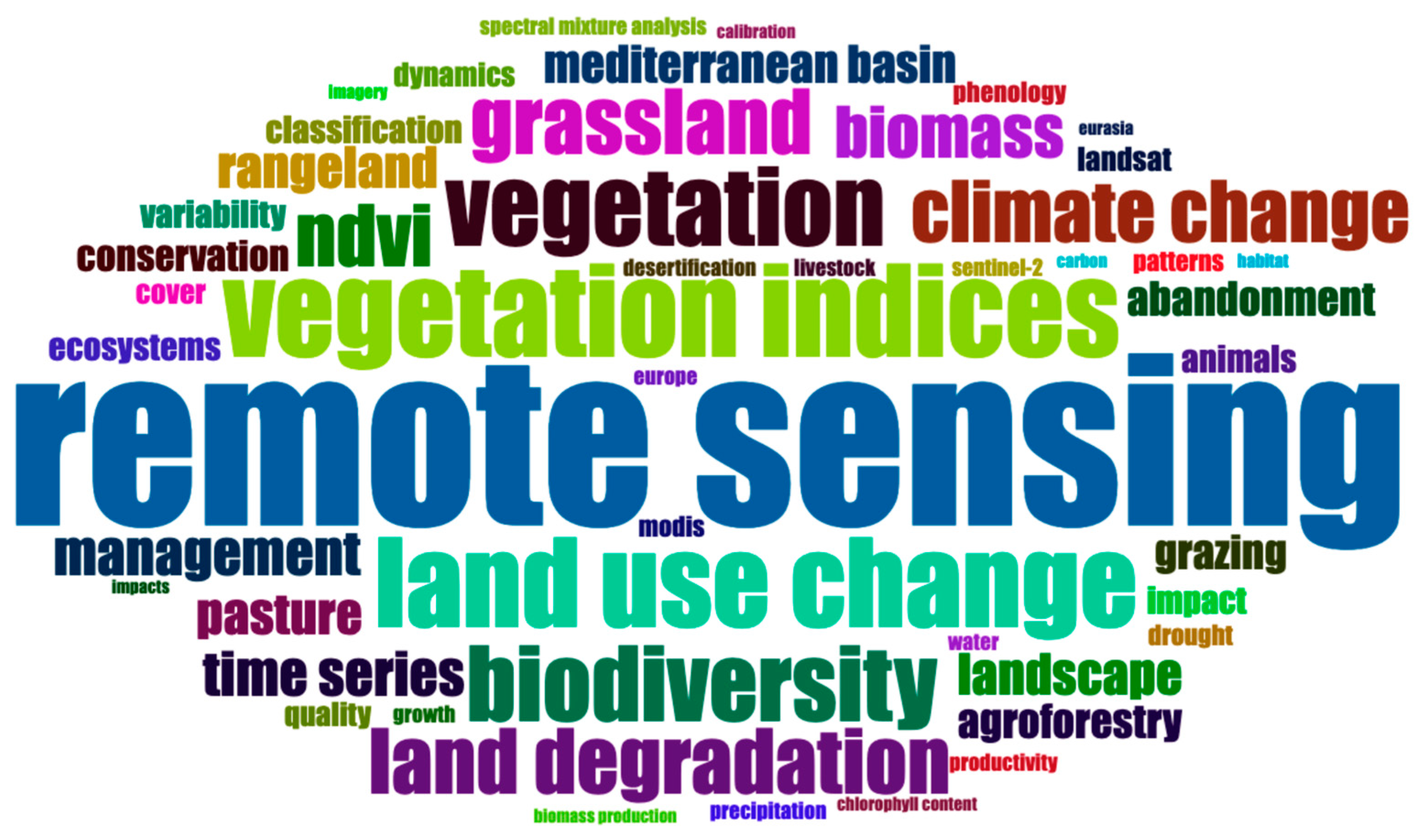 Taken together, these analysis techniques enable the exploration and quantification of the main lexical and thematic patterns present in the analyzed scientific literature, facilitating the interpretation of their internal dynamics and temporal evolution. This organization allows outlining an overview of the methodologies applied and identifying recurring patterns in recent work, with particular reference to the potential and limitations of using RS for the quantitative and qualitative monitoring of the Mediterranean pastures.