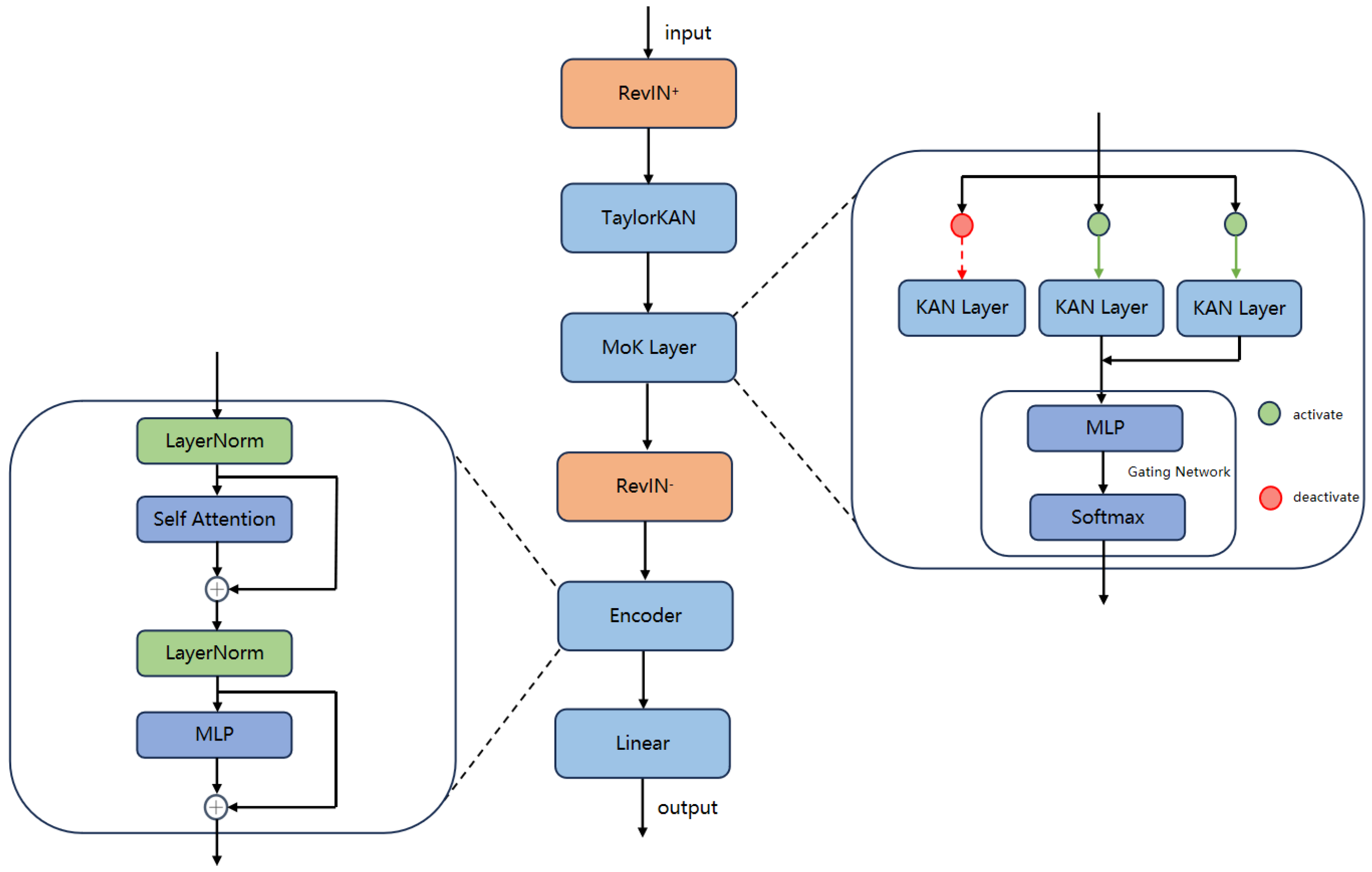 - MoK-based Pre-Transformer Feature Enhancement: A mixture of KAN experts (MoK) layer is introduced before the standard Transformer architecture as a nonlinear feature enhancement layer. The MoK module adaptively aggregates the outputs of multiple KAN experts through a gating mechanism, improving input representations prior to the Transformer encoder and enhancing the model’s ability to capture nonlinear patterns in time series data.