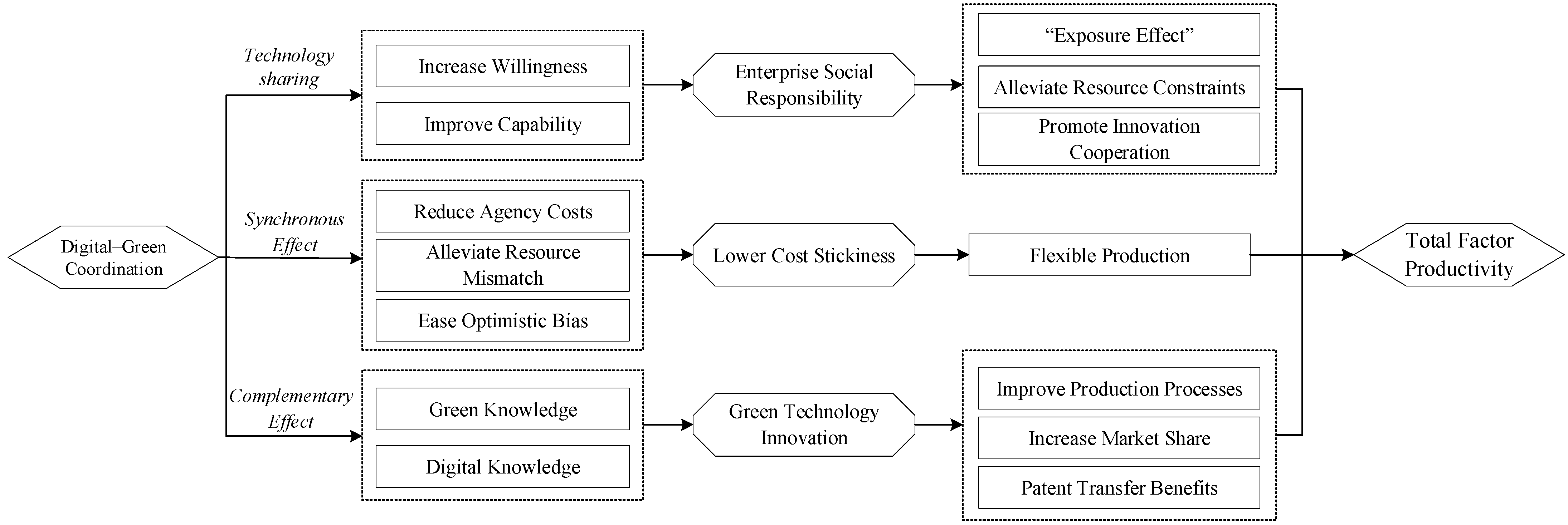 This paper develops a theoretical framework in which digital–green coordination exerts both a direct productivity-enhancing effect and an indirect effect through three key mechanisms: CSR, CS reduction, and GTI (