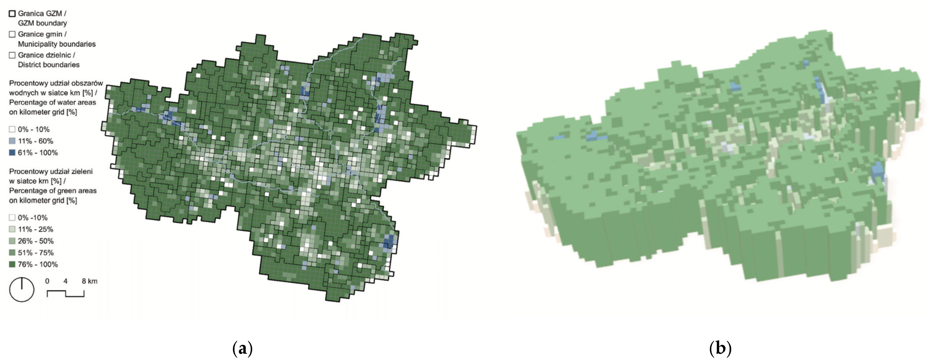 - Blue-green infrastructure—green and water areas present in the urban structure (Figure 5).