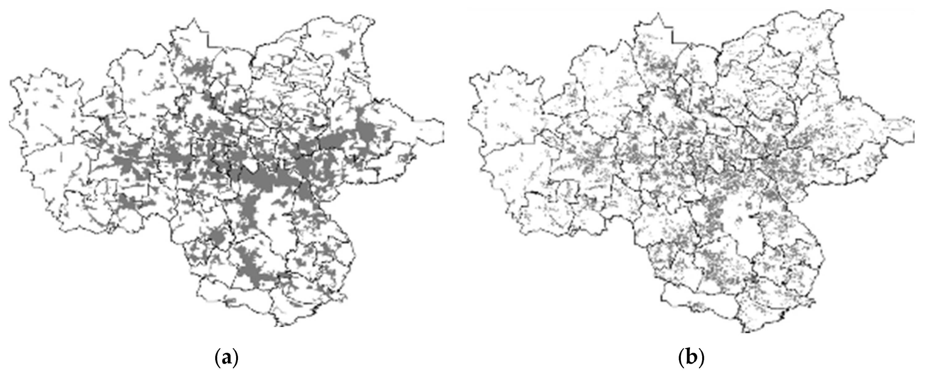 - The share of buildings in urbanized areas—that is, the percentage of the area of buildings to the area of urbanized areas in a given cell (Figure 4).