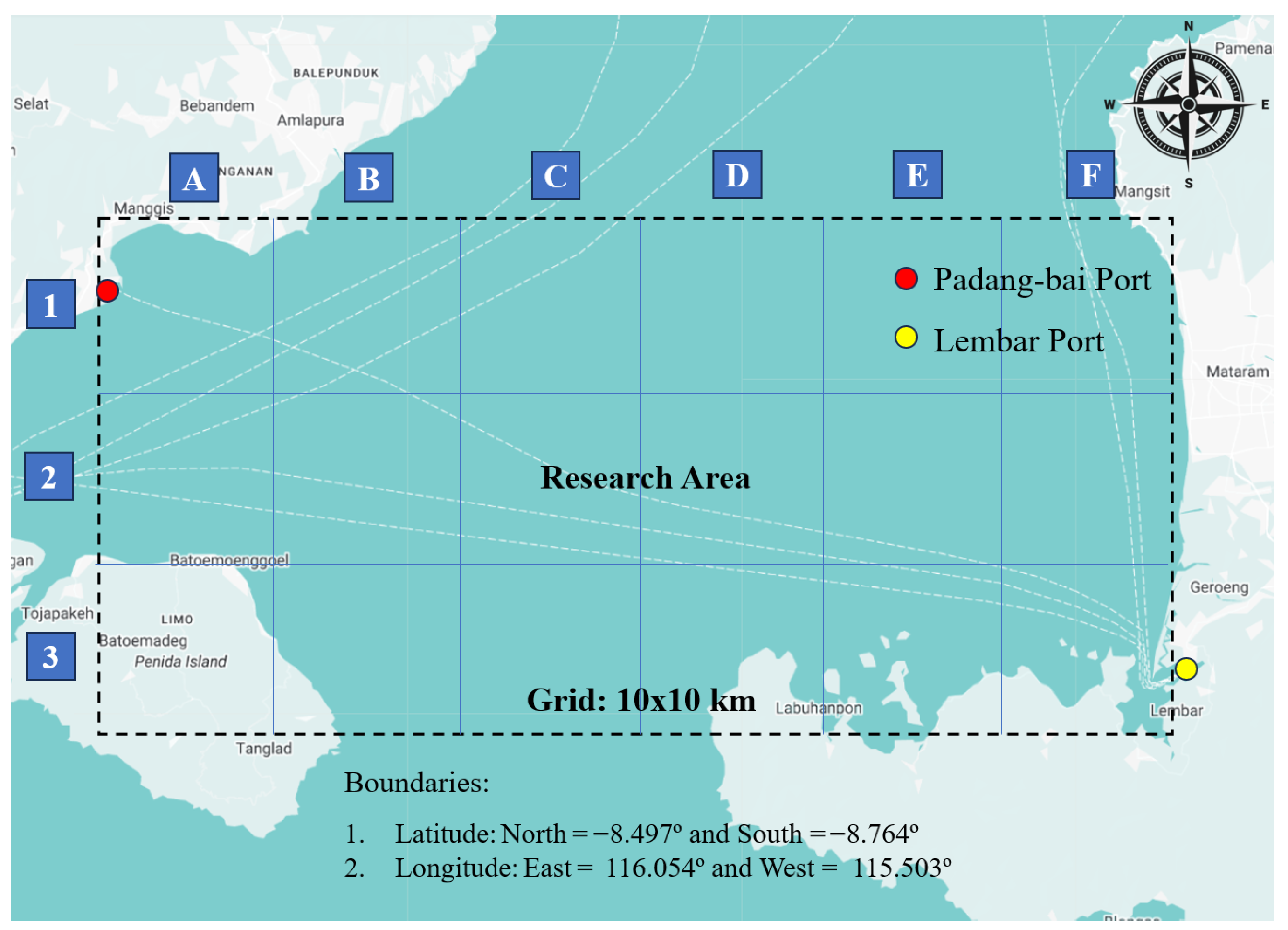 Figure 8, the highest density was found in grid A1 near Padangbai Port and grid F3 near Lembar Port, while other grids show a more even distribution. Although A1 and F3 recorded higher traffic than the surrounding areas, the total number of ships is still lower than in the Bali Strait. Meanwhile, columns C and D represent international shipping lanes.