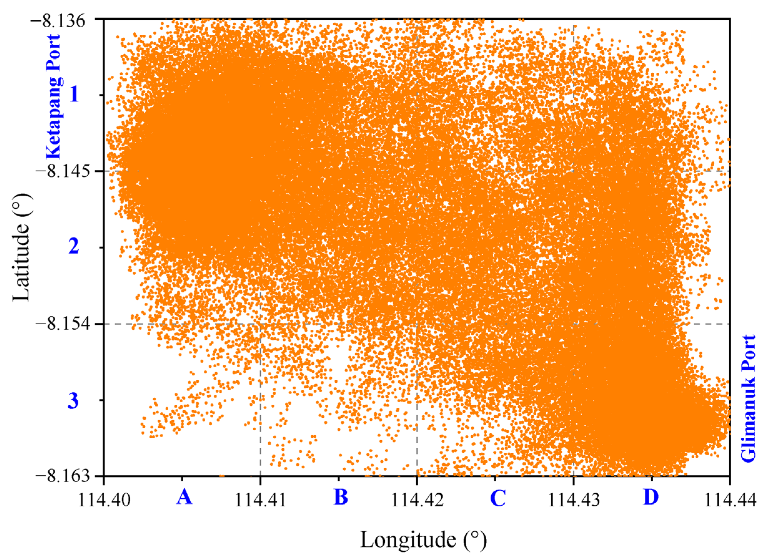 During one month of data collection, a total of 156,297 ship records were obtained, with passenger vessels dominating at 90.33%. This highlights the dominance of passenger transport in the area, largely linked to the busy inter-island crossing routes such as Ketapang–Gilimanuk. The analysis further shows that the highest traffic density occurred in grids A1 and D3, as shown in