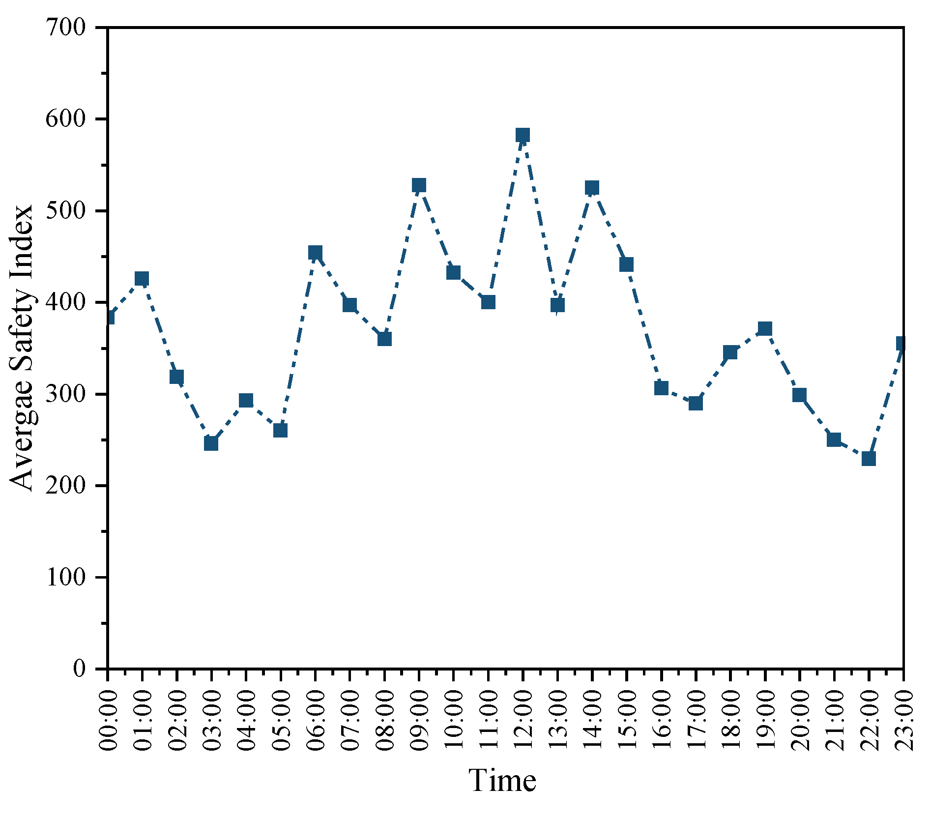 Figure 9 illustrates the temporal variation in the average safety index in the Bali Strait over a 24 h period. The safety index tends to be higher during the late night to early morning hours, with values reaching approximately 1700–1800, indicating elevated navigational risk during nighttime operations. In contrast, lower safety index values are observed during the morning and early evening, with values decreasing to around 1300–1600. Toward midday, the safety index increases again and reaches intermediate to high values of approximately 1500–1900, reflecting increased vessel activity during peak operational hours. Overall, the results show a clear temporal dependency of navigational risk, with higher risk occurring during nighttime and peak traffic periods compared to daytime conditions.