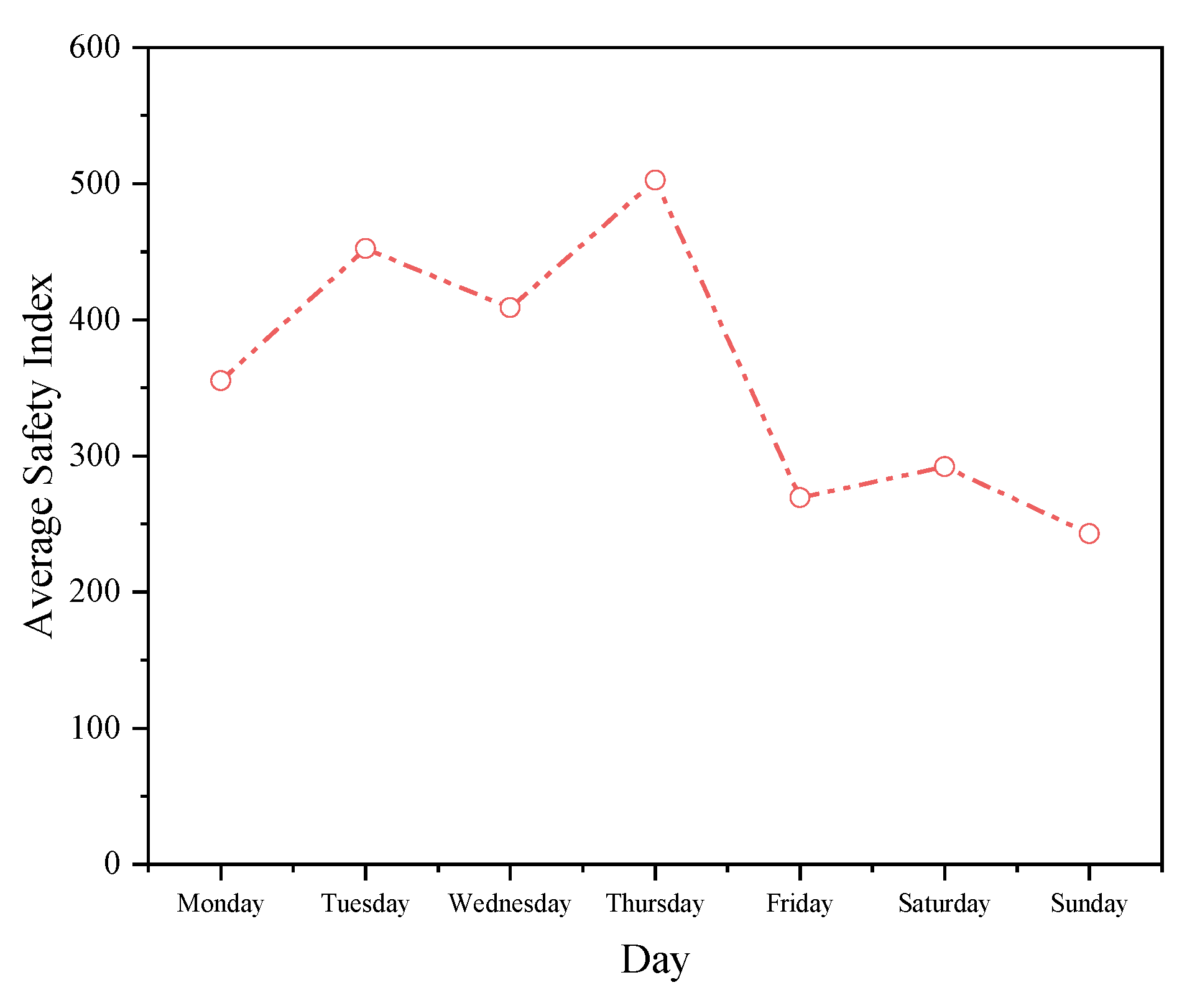 Figure 13. The safety index shows a clear weekly fluctuation, indicating that navigational risk changes in response to vessel activity patterns. At the beginning of the week, the safety index is at a moderate level, with a value of around 355 on Monday, and increases noticeably on Tuesday to approximately 452. A slight decrease is observed on Wednesday, when the safety index drops to about 408.