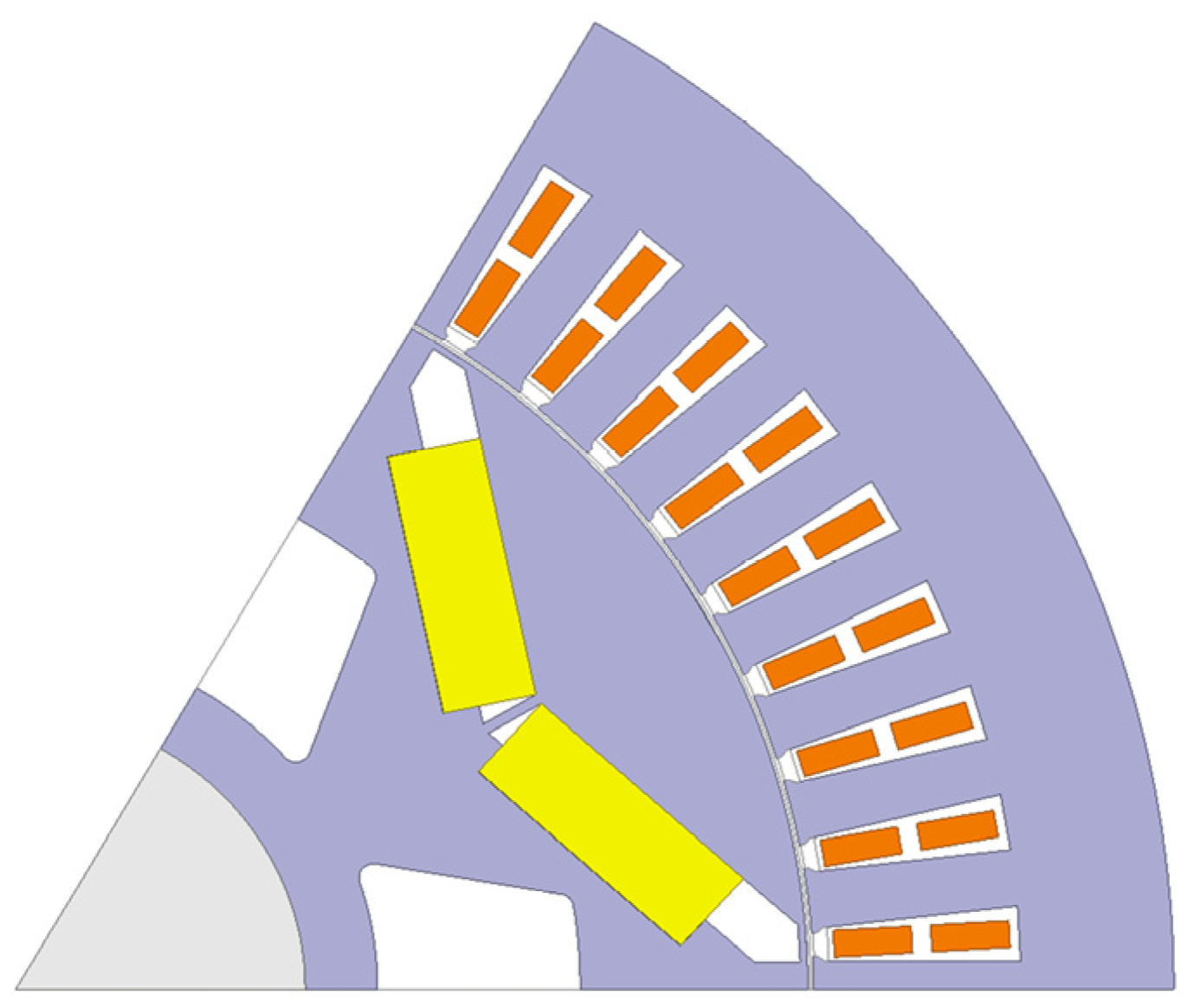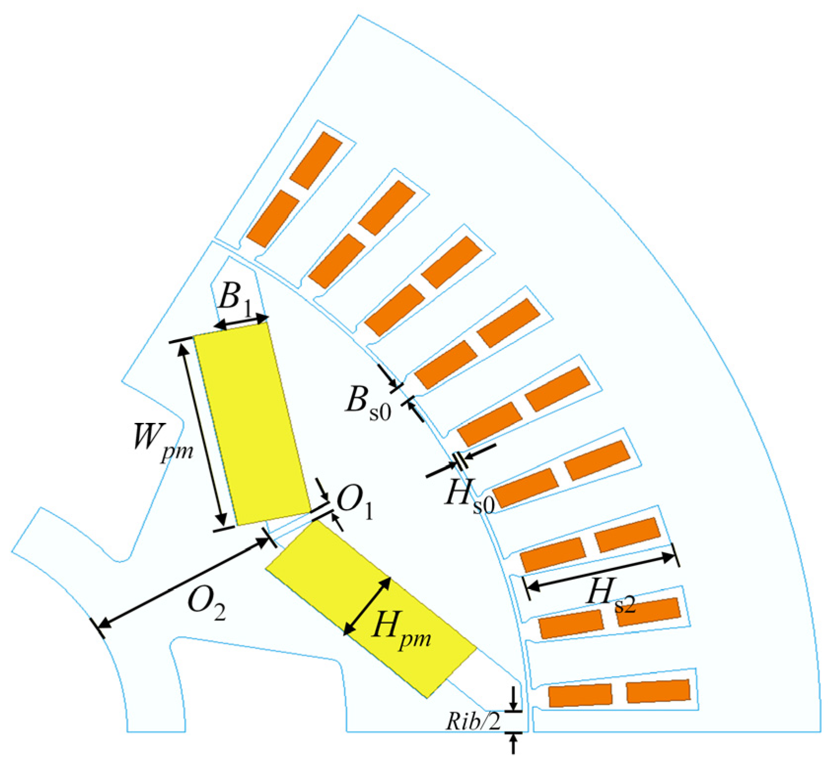 - Wang, S.-C.; Nien, Y.-C.; Huang, S.-M. Multi-Objective Optimization Design and Analysis of V-Shape Permanent Magnet Synchronous Motor. Energies 2022, 15, 3496. [Google Scholar] [CrossRef]