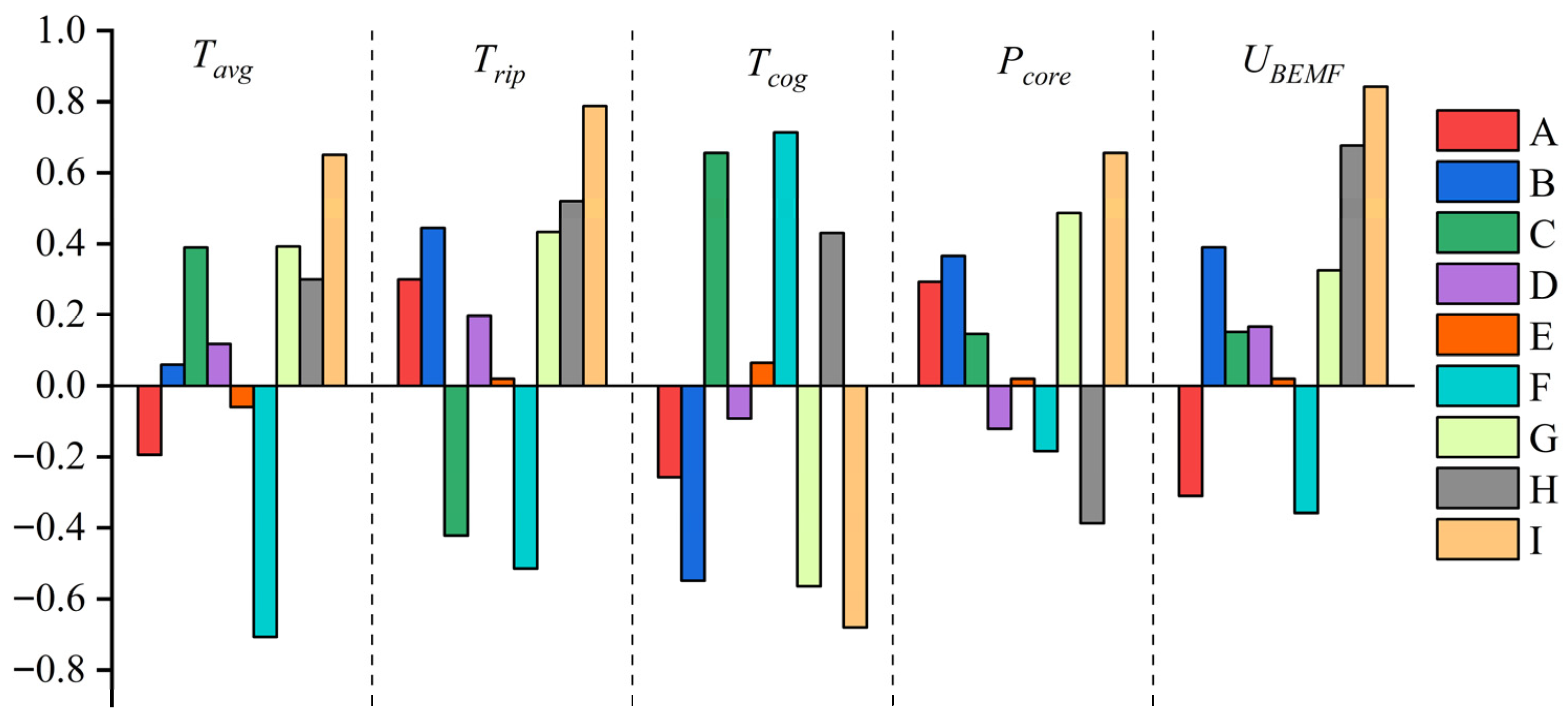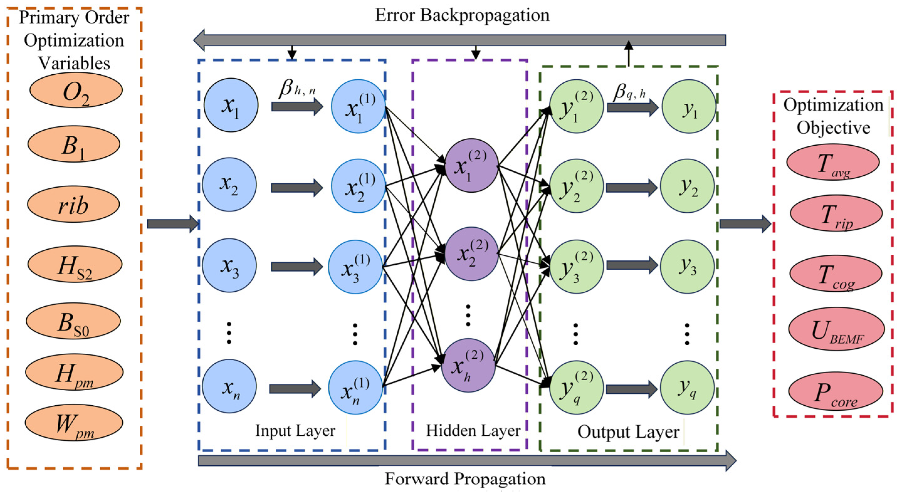 - For the seven high-order optimization variables, the MO-LHS method is adopted to construct a data sample space with excellent uniformity and orthogonality. Subsequently, the BPNN surrogate model is employed to predict and fit the motor performance, which reduces the computational cost. The correctness of the high-precision BPNN model and the optimization algorithm is verified, and the relative error of all optimization objectives is less than 3%.