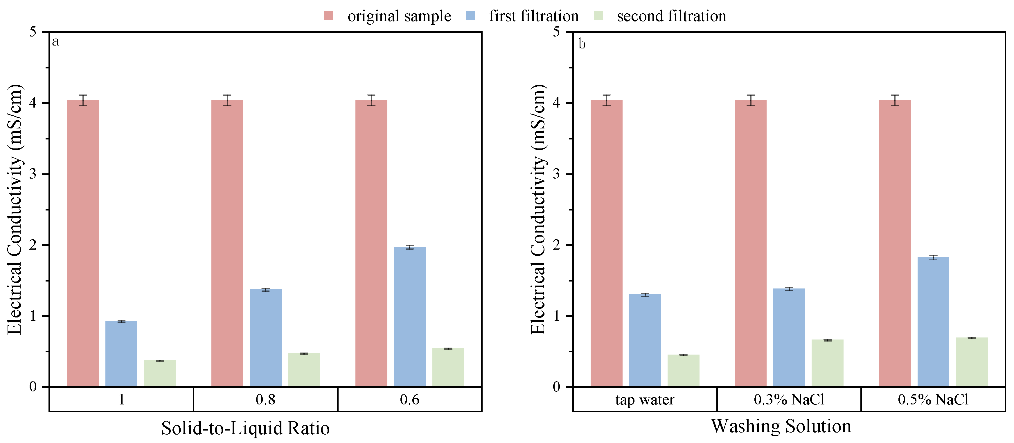 To investigate the influence of different washing solutions on the salt content of dredged sediment, three washing media were selected: tap water, 0.3% NaCl solution, and 0.5% NaCl solution. Two rounds of vacuum filtration were performed using a fixed water-to-sediment ratio of 0.8. As shown in