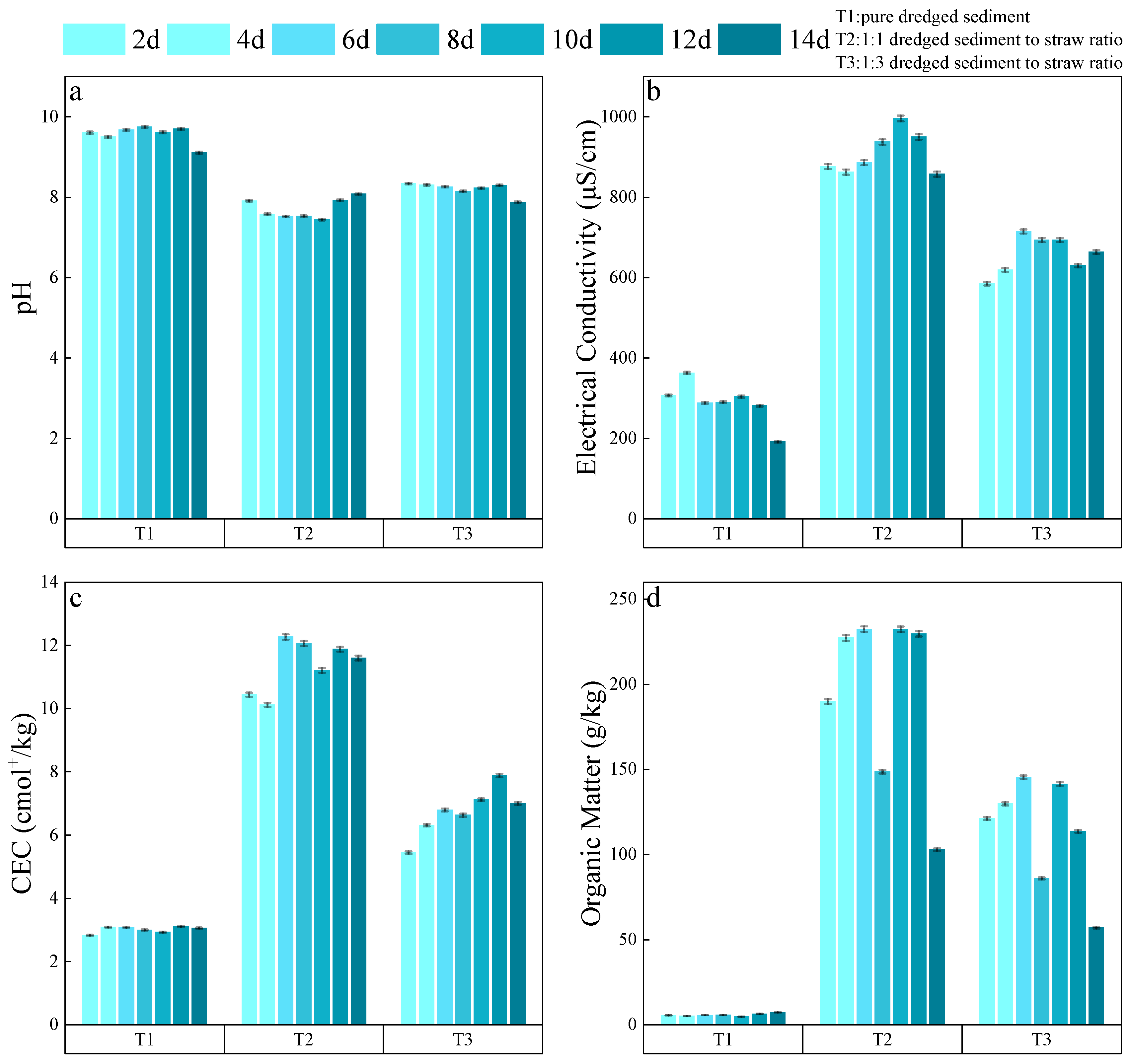 Figure 2c, in the T1 group (pure dredged sediment), CEC values remained consistently low, ranging from 2.83 to 3.11 cmol
