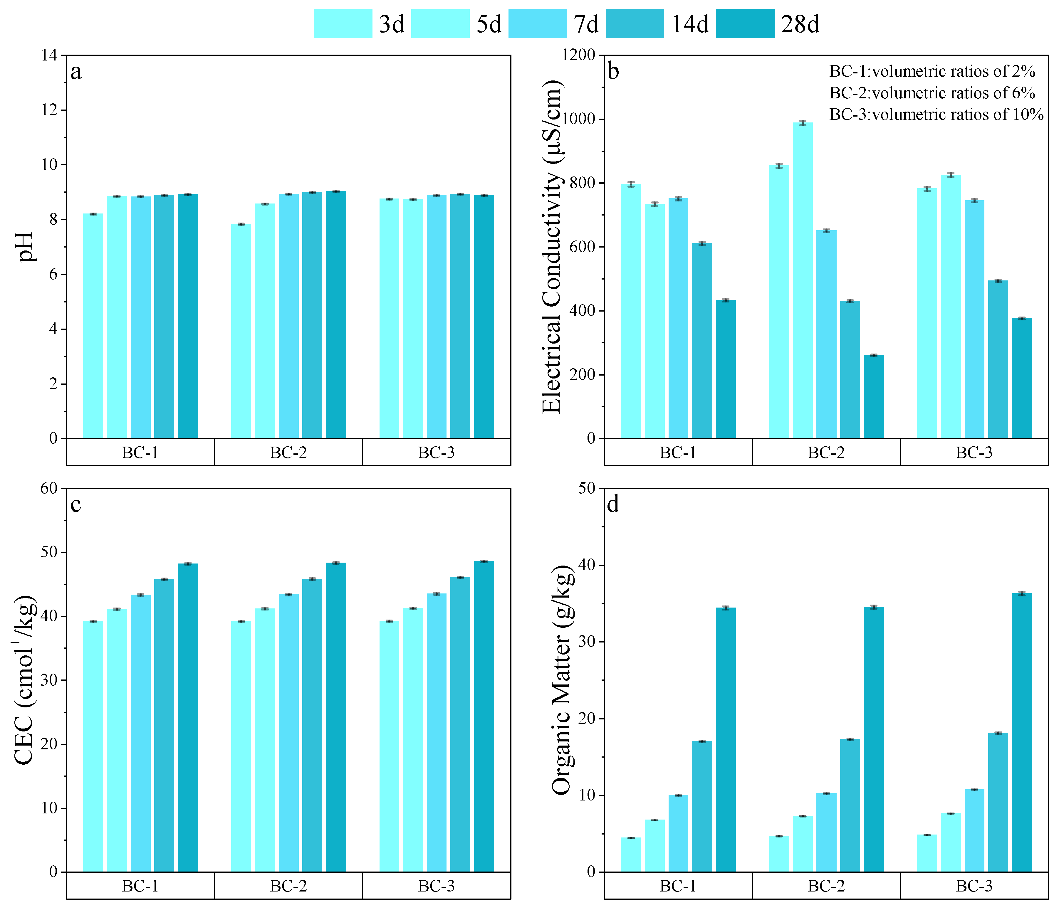 Figure 3c,d, with respect to soil fertility enhancement, the effects of BC were particularly pronounced. After 28 days of incubation, all BC-treated groups exhibited substantial increases in OM content, reaching 34–36 g/kg, which meets the minimum requirement (20 g/kg) set by