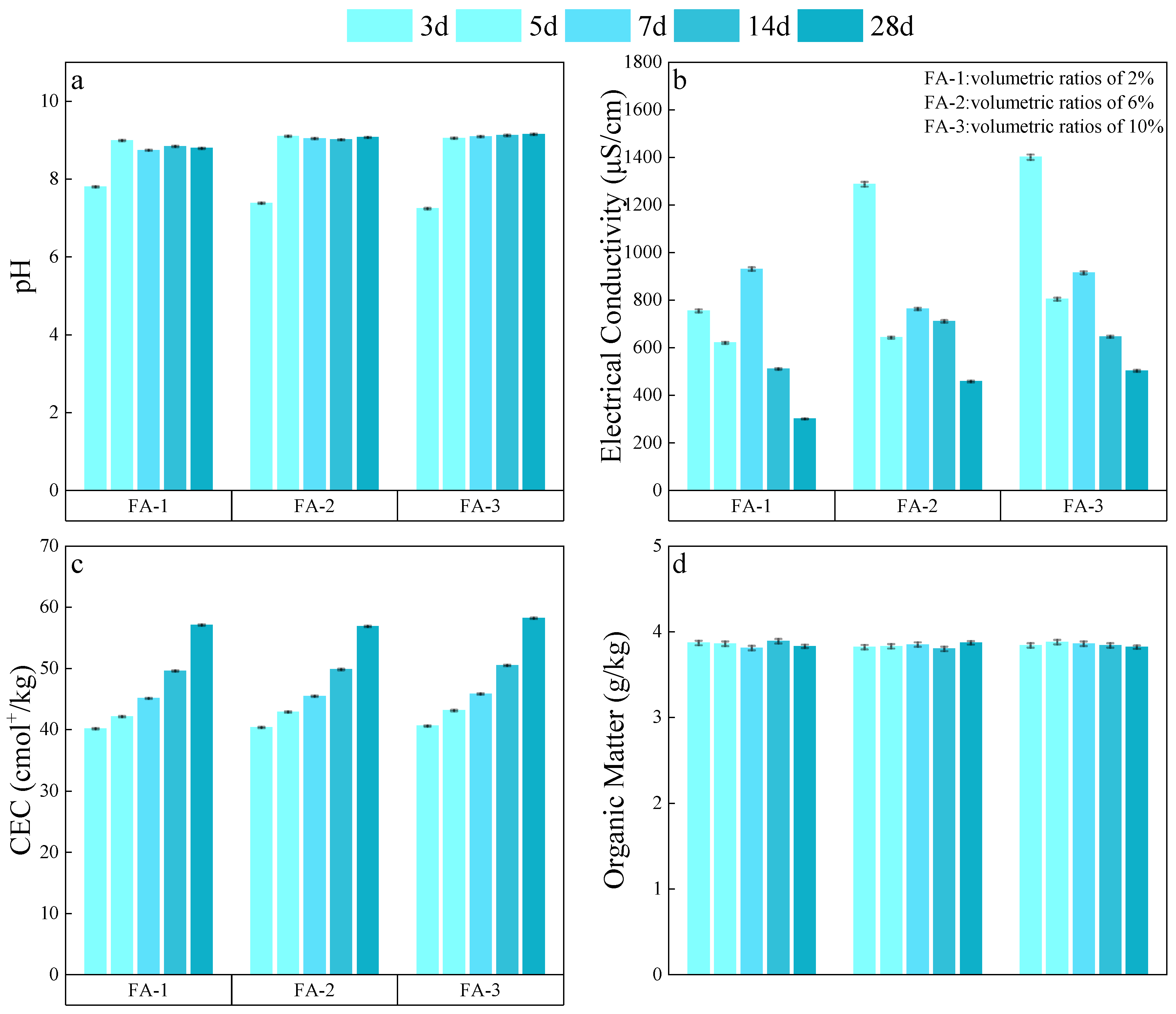 Figure 4b). In FA-2 and FA-3 groups, elevated EC was observed as early as day 3, followed by a significant decrease over time. By day 28, EC levels varied notably among treatments, with FA-1 reaching 301 μS/cm and FA-3 rising to 503 μS/cm. This pattern can be attributed to the dissolution and release of soluble salts (e.g., K
