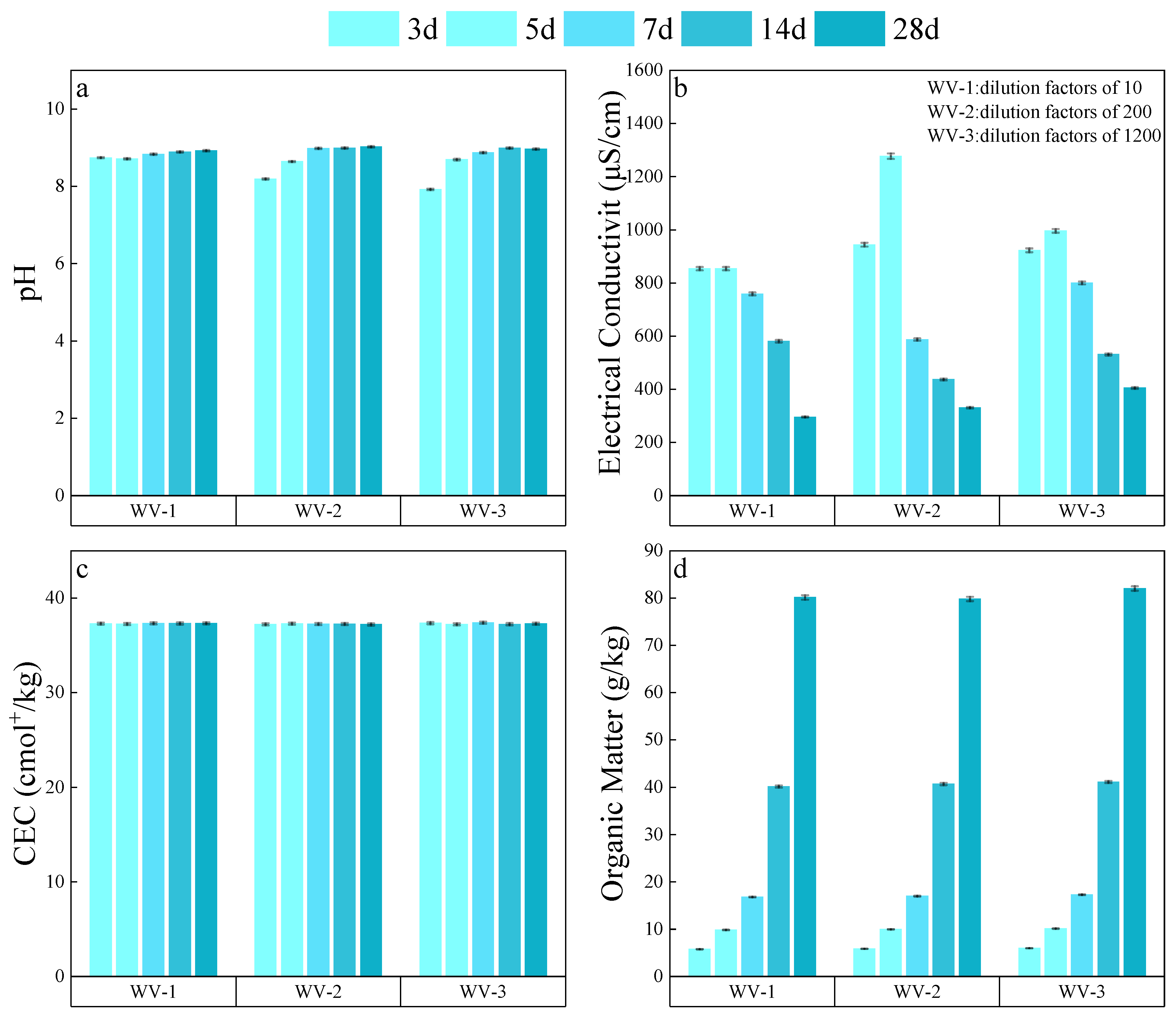This study demonstrated that WV, as an organic amendment, exerted significant and distinctive effects on key physicochemical properties of dredged sediment. WV was added at 16 mL/g per gram of sediment with dilution factors of 10, 200, and 1200 times (WV-1, WV-2 and WV-3). According to