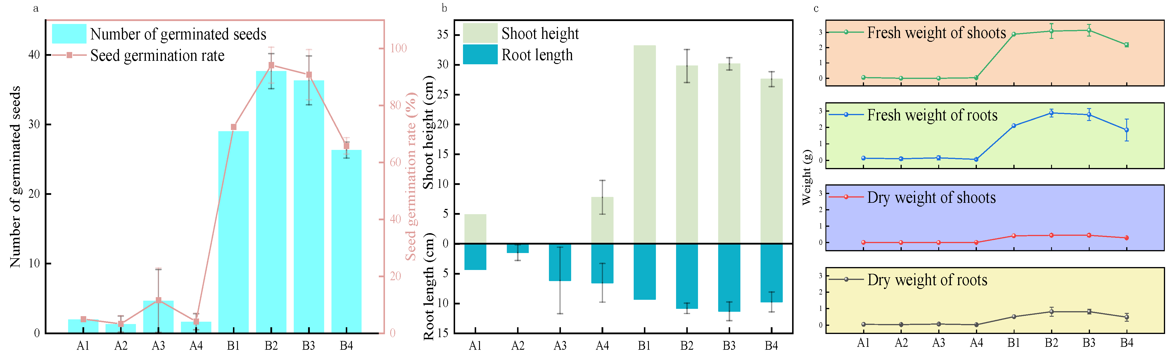 The above-ground growth results further verified the treatment effects. In the raw dredged sediment, the plant height in group A1 was 4.90 cm, with fresh and dry aboveground weights of 0.05 g and 0.006 g, respectively. Although a few seedlings emerged in group A4, their height was 7.80 cm, with fresh weight reduced to 0.037 g, and no seedlings were observed in A2 and A3, indicating that WV could not exert positive effects under high-salinity conditions. In particular, in groups A2 and A3, the combination of high WV concentration and high salinity might have created a synergistic toxic effect, further suppressing plant growth. In the desalinated treatments, the plant heights in groups B1–B4 were 33.2, 29.8, 30.2, and 27.6 cm, respectively, with fresh weights of 2.88 g, 3.09 g, 3.14 g, and 2.19 g, all significantly higher than in the A groups, demonstrating that desalination substantially alleviated salt stress and improved the plant growth environment. Although B1 exhibited the greatest plant height among the desalinated treatments, its biomass accumulation was lower than that of B2 and B3. This suggests that the enhanced plant height in B1 reflects a preferential shoot elongation response under limited organic nutrient availability, rather than superior overall growth [