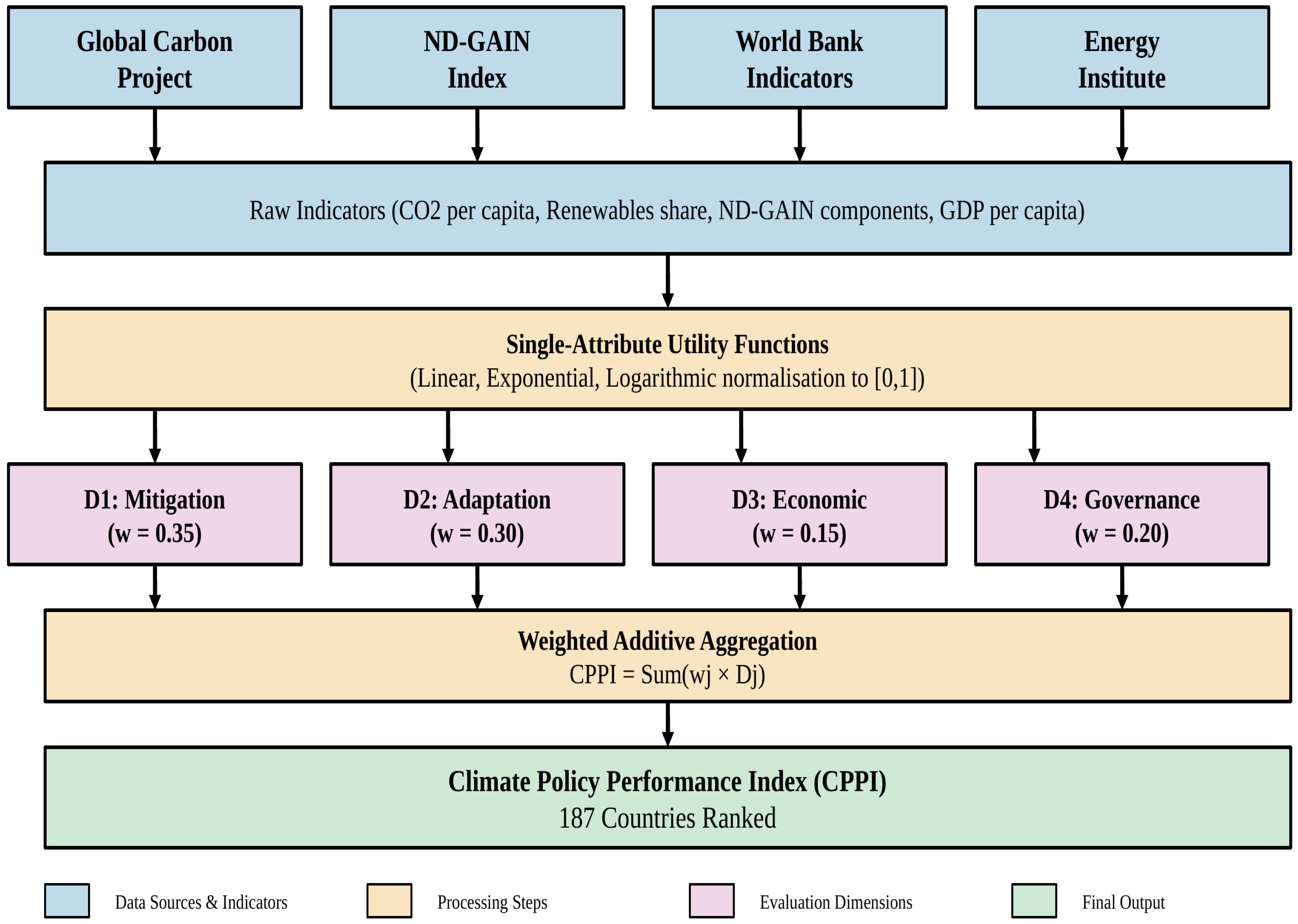 7] and leveraging publicly available data from the Global Carbon Project, ND-GAIN Index, and World Bank, the proposed Climate Policy Performance Index (CPPI) integrates four fundamental dimensions: mitigation effectiveness, adaptation capacity, economic readiness, and governance quality. The framework advances beyond existing indices by providing explicit utility functions, axiomatic foundations, and comprehensive sensitivity analysis.