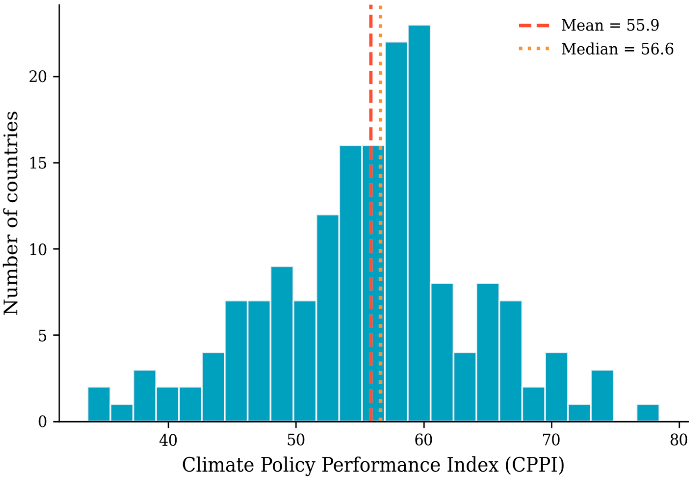 The EU-27 mean CPPI of 58.12 significantly exceeds the global average (55.86), confirming the region’s relative climate leadership. However, the within-EU standard deviation (6.94) indicates that this aggregate performance masks substantial variation across member states. Bulgaria and Hungary score below 51, while Nordic leaders exceed 71—a 20-point gap within a nominally integrated policy space. This dispersion has implications for EU climate governance, suggesting that uniform targets may impose disproportionate burdens on lower-capacity members while leaving higher-capacity members insufficiently challenged.