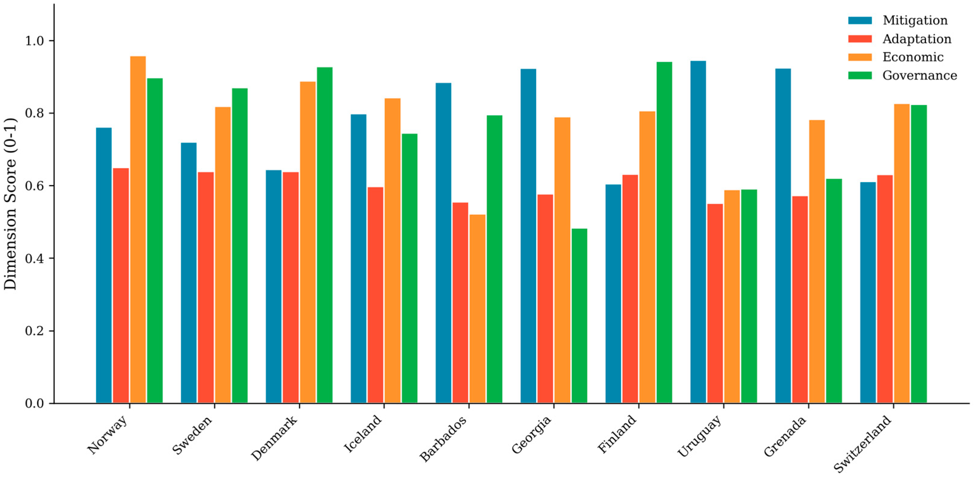 Fourth, the framework’s global coverage (187 countries) enables assessment of nations excluded from major emitter-focused indices. Small island developing states, low-income African nations, and post-Soviet states are systematically evaluated, revealing both unexpected leaders (Barbados, Georgia, and Armenia) and underperformers (Turkmenistan) that escape scrutiny in narrower indices. This expanded coverage supports more equitable global climate governance by including all parties to international agreements.