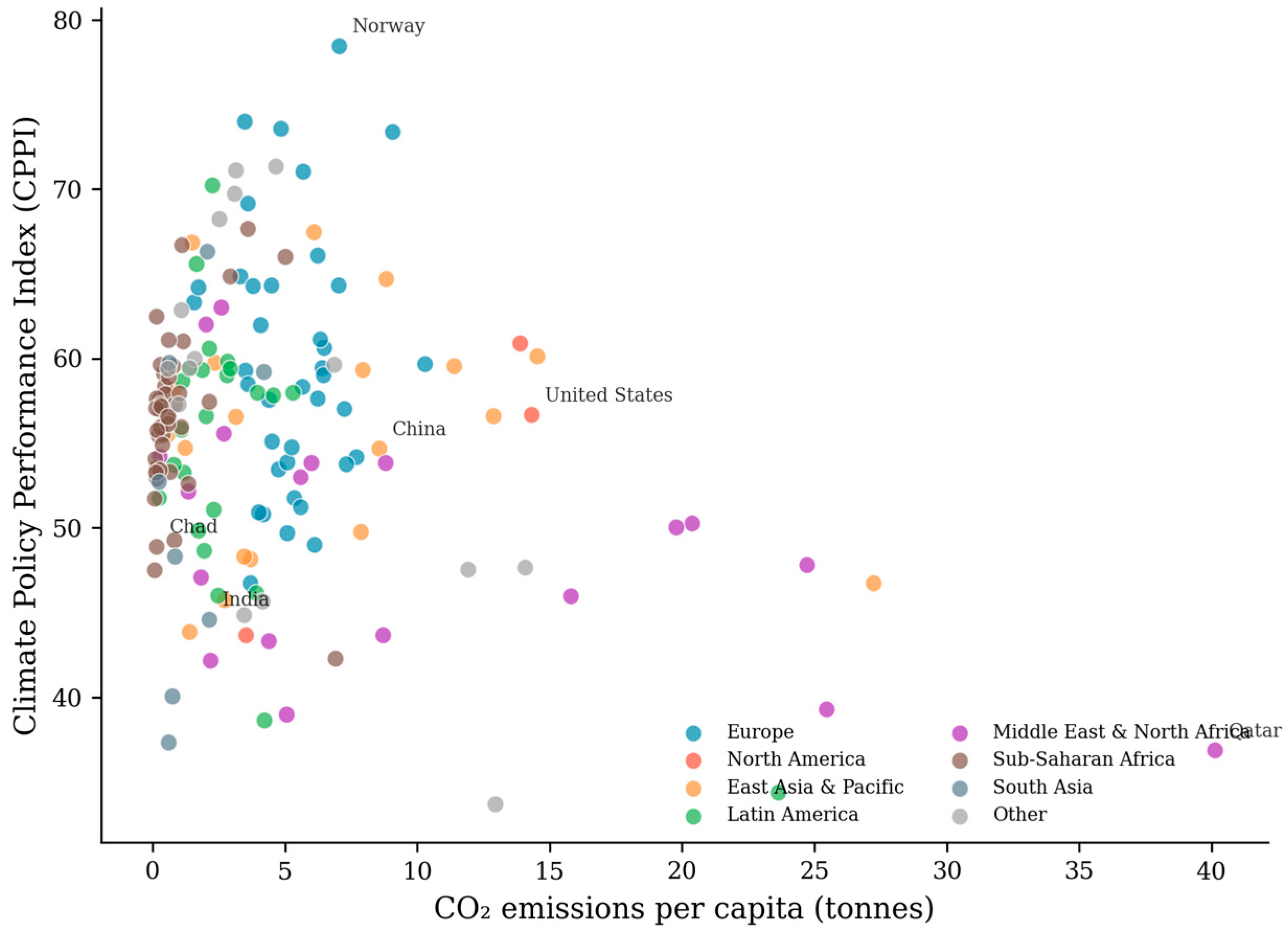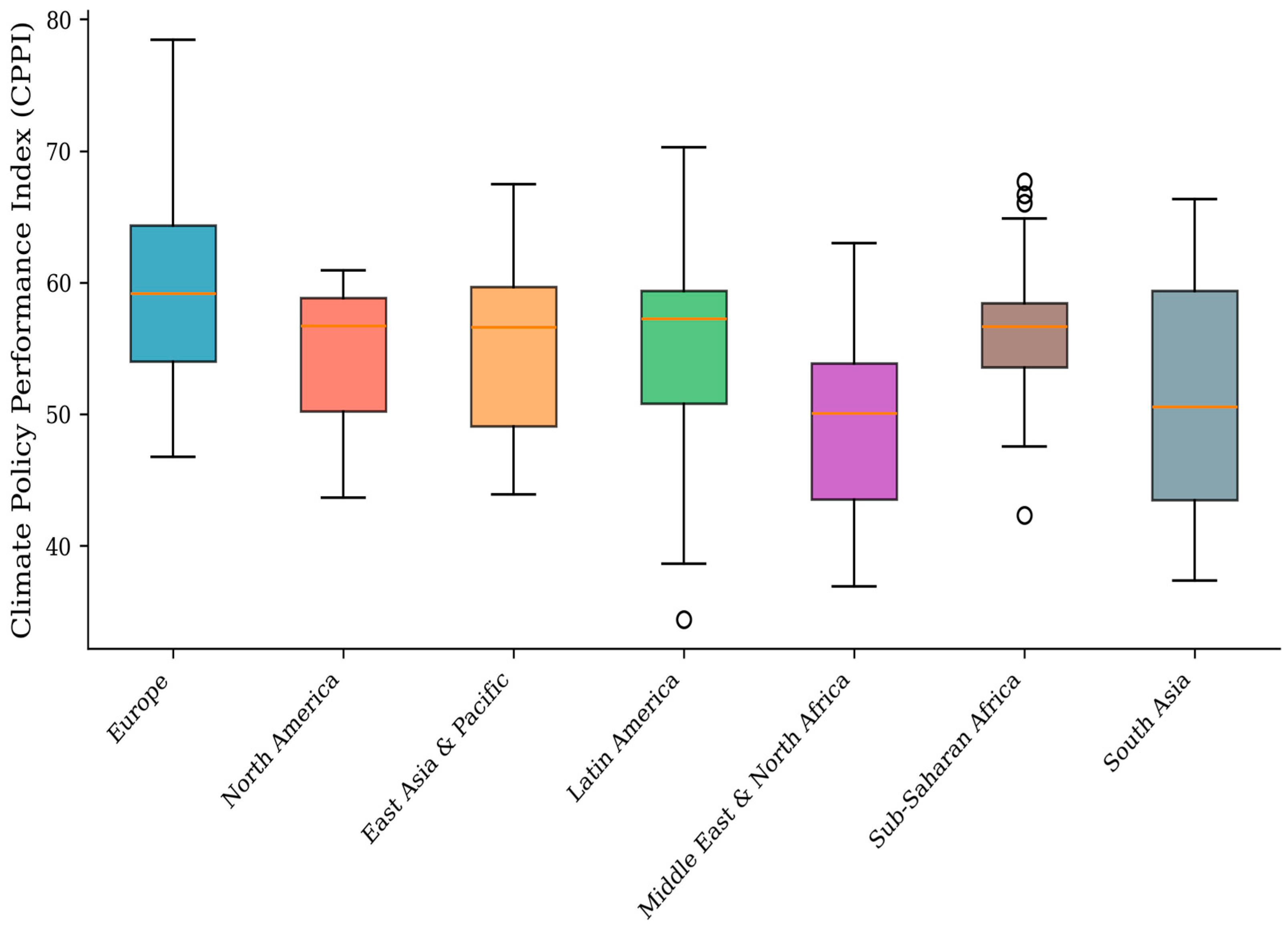 The Middle East and North Africa region ranks lowest (CPPI = 49.12), primarily due to weak mitigation performance in fossil fuel-exporting economies. This regional pattern aligns with broader research on the relationship between resource dependence and climate policy ambition. The ‘resource curse’ literature suggests that hydrocarbon wealth creates structural barriers to decarbonization through vested interests, Dutch disease effects, and reduced incentives for economic diversification [