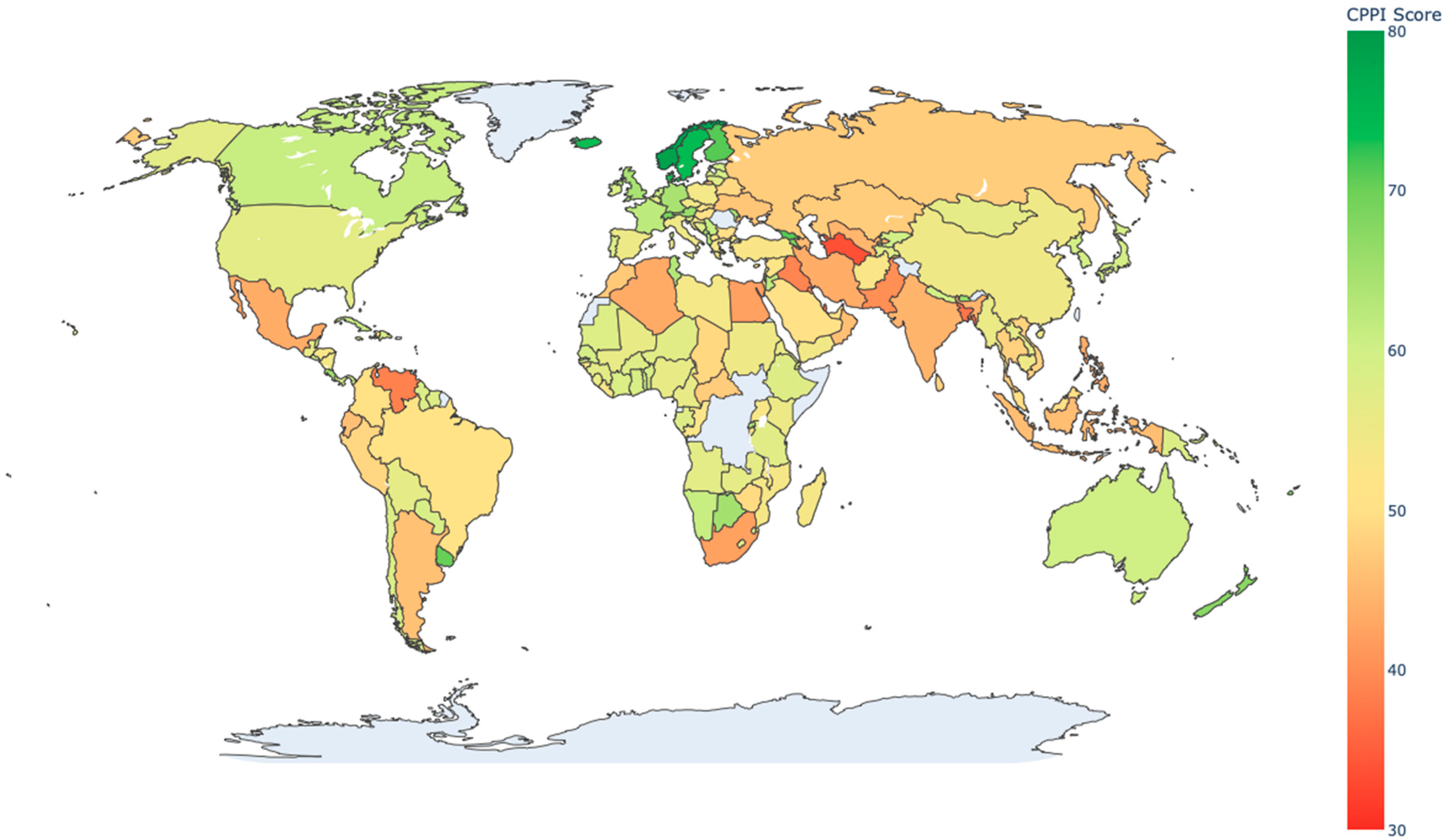First, Norway emerges as the global leader (CPPI = 78.46), followed by Sweden, Denmark, and Iceland. These Nordic countries achieve high scores by balancing excellence across four dimensions: moderate-to-low emissions, strong deployment of renewable energy, robust adaptation capacity, and high-quality governance institutions. This finding contrasts with indices that focus solely on emissions, in which low-income countries with minimal industrial activity often rank highest despite limited institutional capacity for sustained climate action.