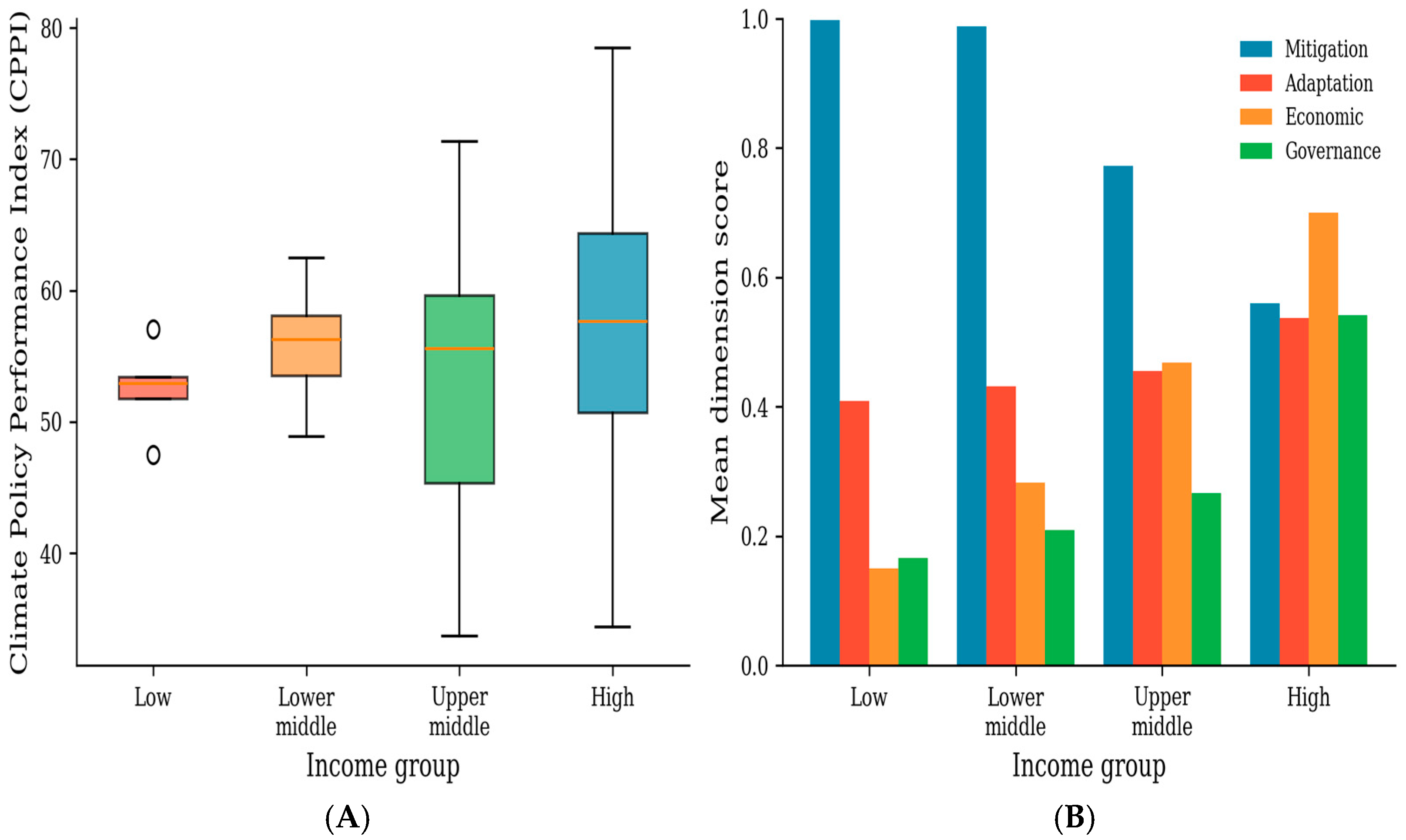 The non-monotonic relationship between income and CPPI merits particular attention. High-income countries achieve the highest mean score (57.09) but exhibit substantial internal variation, with Qatar and Kuwait among the lowest performers globally. Lower-middle-income countries achieve comparable aggregate performance (56.05) through fundamentally different dimension profiles. This finding challenges simplistic narratives that frame climate action as a luxury of wealthy nations, as institutional quality and policy commitment appear at least as important as economic resources in determining climate performance.