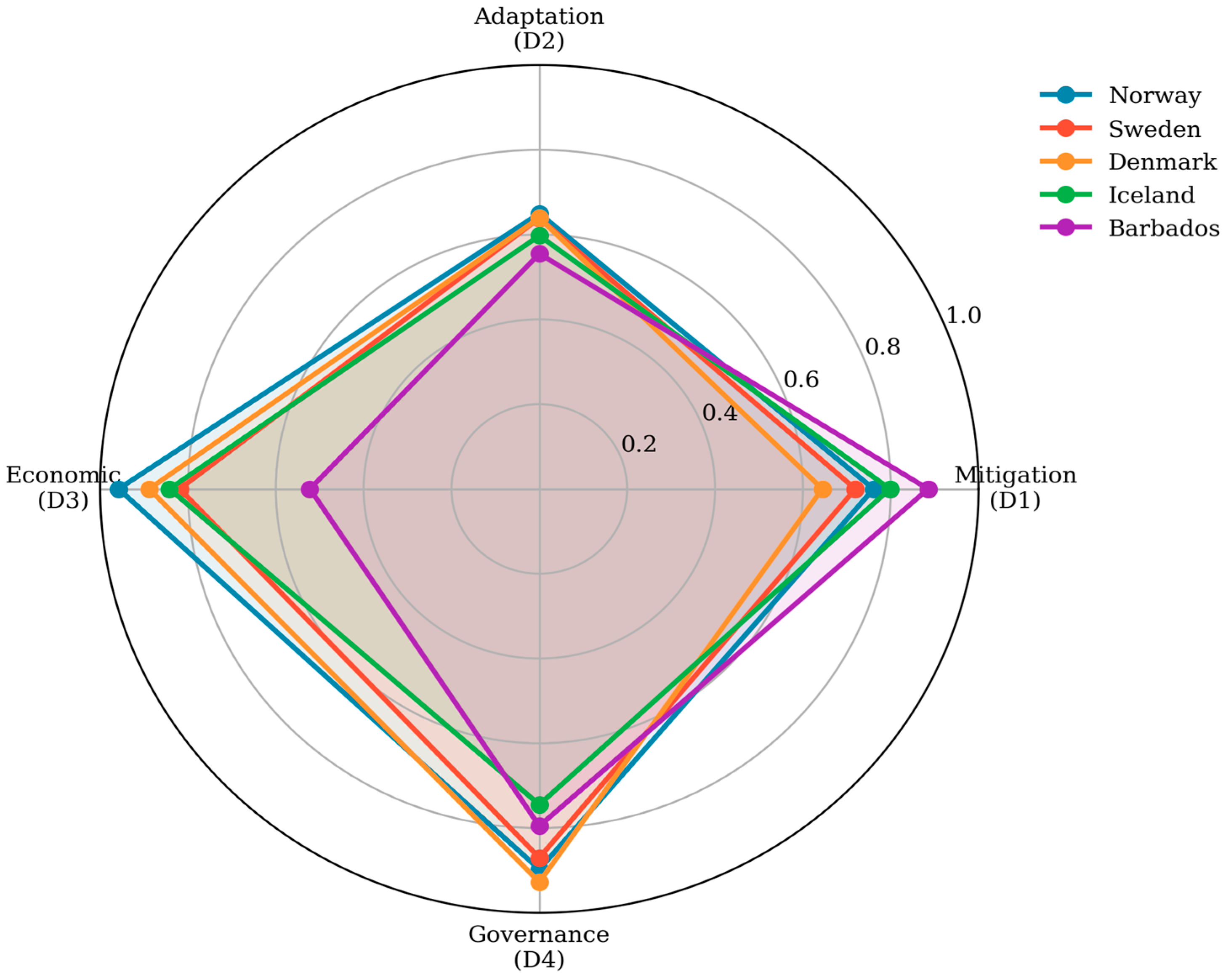 Second, the analysis reveals distinct performance archetypes among high-ranking countries. Norway and Denmark exemplify the ‘balanced performer’ archetype with consistently high scores across dimensions. Uruguay represents the ‘mitigation leader’ pathway, achieving exceptional D1 scores (0.945) through low emissions and high renewable penetration, compensating for moderate governance capacity. Singapore illustrates an alternative ‘governance–economy’ pathway, where world-class institutions (D4 = 0.926) and economic readiness (D3 = 0.955) offset weaker mitigation performance (D1 = 0.393). These diverse pathways underscore that climate policy success admits multiple configurations, challenging one-size-fits-all policy prescriptions.