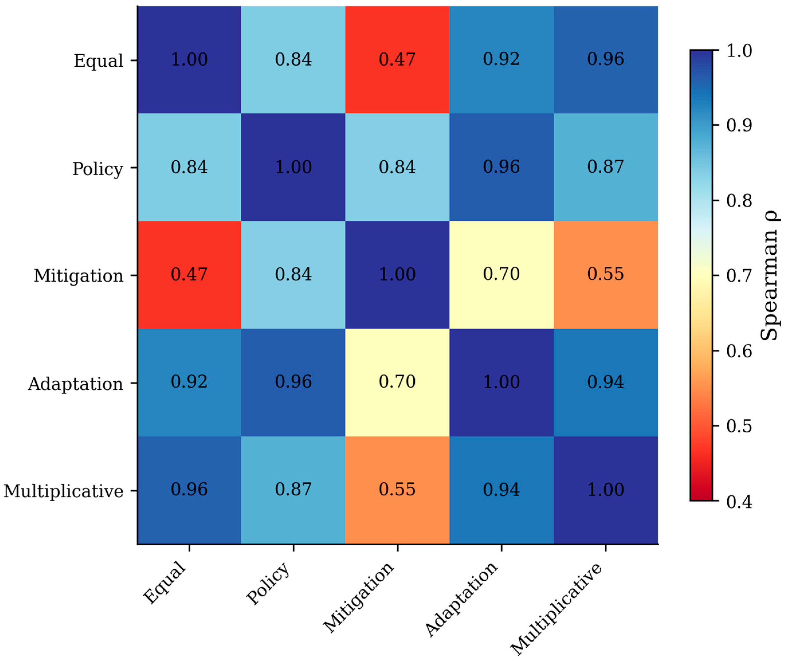 A critical methodological distinction concerns the transparency of weighting. Existing indices typically employ fixed, expert-determined weights without systematic sensitivity analysis. The CPPI framework explicitly models weight uncertainty through four alternative schemes (equal, policy-aligned, mitigation-focused, and adaptation-focused) and multiplicative aggregation. The high rank correlations among most schemes (ρ > 0.83) provide reassurance that rankings are reasonably robust, while the lower correlation with mitigation-focused weights (ρ = 0.47 vs. equal) reveals the substantive impact of normative choices regarding dimension priority.
