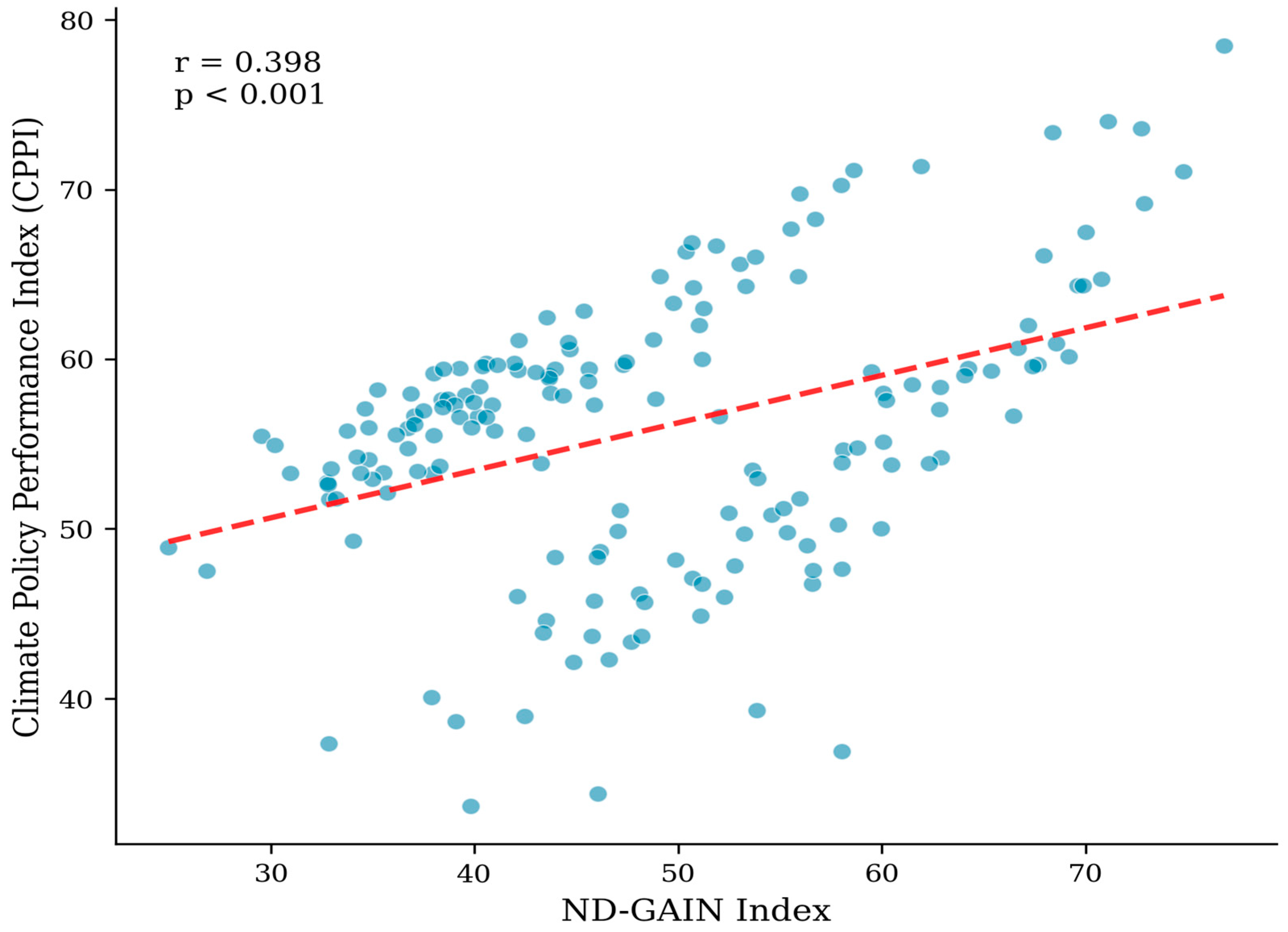 The moderate correlation between CPPI and ND-GAIN (r = 0.398) indicates that these indices capture related but distinct constructs. ND-GAIN emphasises vulnerability and adaptation readiness without explicit mitigation assessment, while CPPI integrates both dimensions. Countries with high ND-GAIN scores but moderate CPPI rankings (e.g., Singapore and Australia) typically exhibit strong adaptation capacity, but this capacity is undermined by high emissions. Conversely, low-emission developing countries (Rwanda and Bhutan) achieve higher CPPI rankings than their ND-GAIN positions would suggest, reflecting the credit CPPI assigns to mitigation performance.