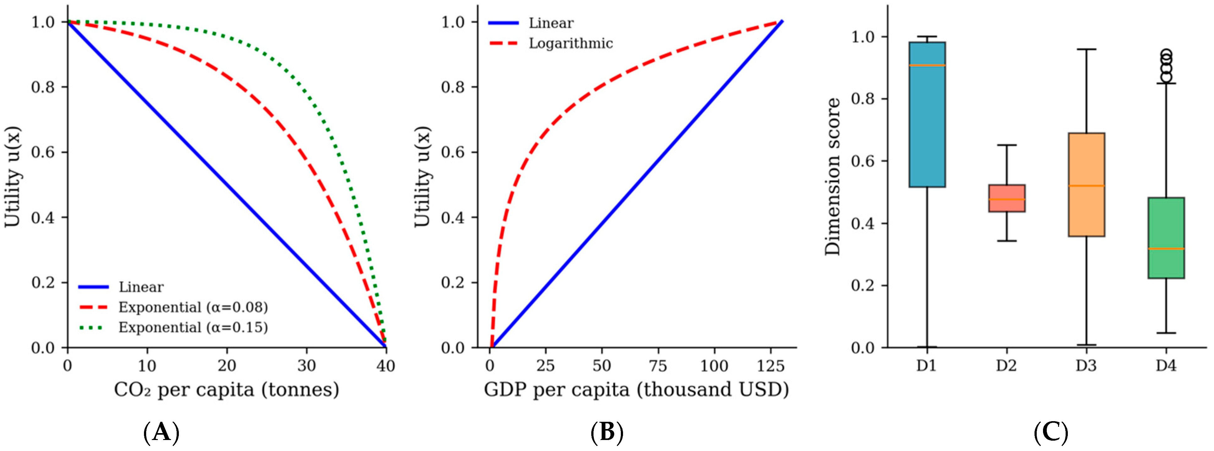 For the CO2 per capita attribute, we calibrate α based on the assumption that reducing emissions from 10 to 5 tonnes per capita yields approximately 1.5 times the utility gain of reducing from 5 to 0 tonnes. This yields α ≈ 0.15.