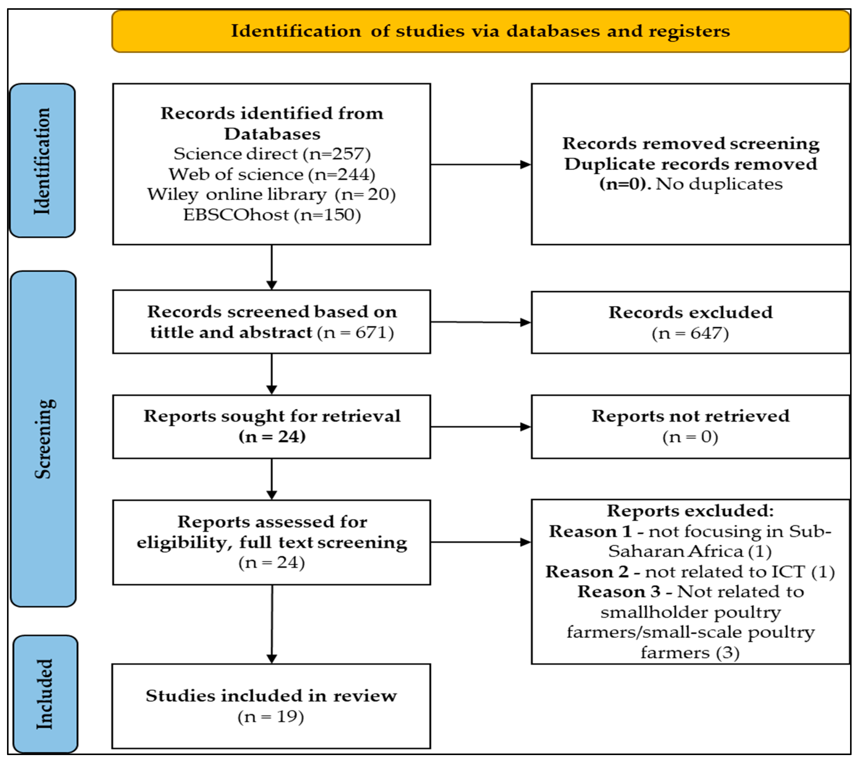 | Region | “ICT” OR “Information communication technology” AND “market participation” AND “smallholder farmers” OR “small-scale farmers” AND “livestock” AND/OR “poultry” AND “Sub-Saharan Africa” | 1449 |