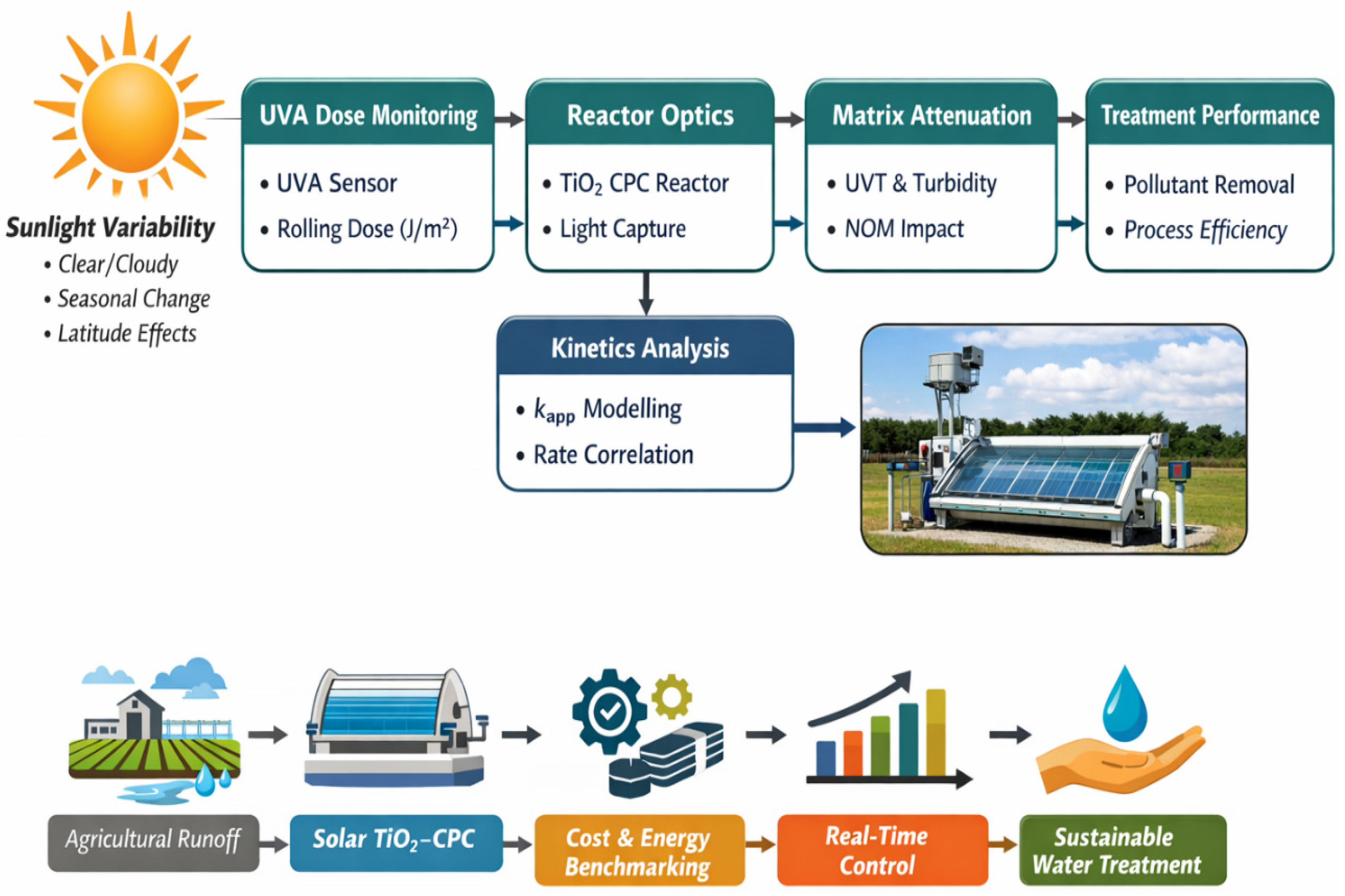 This study moves beyond laboratory demonstration of solar photocatalysis by showing that outdoor TiO2–CPC performance can be interpreted, predicted, and operationally improved when the system is treated as a coupled environmental–engineering process. Three interlinked insights emerge: Firstly, photon availability must be treated spectrally, rather than energetically. Secondly, water-matrix optics are central to real-world performance. Thirdly, intelligent operation can compensate for environmental variability without increasing material or energy inputs.