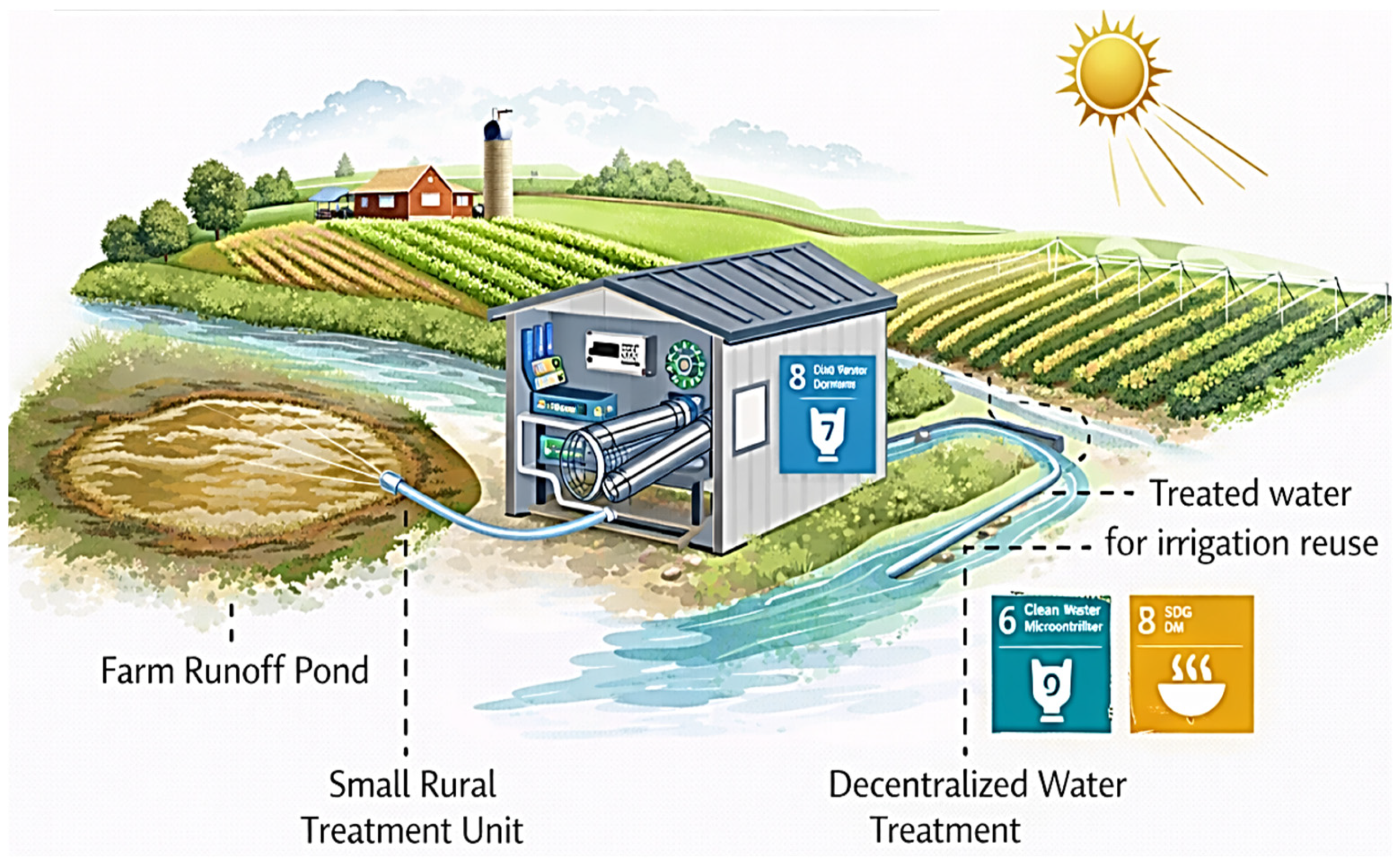 2–CPC treatment unit that captures agricultural runoff and converts it into treated water suitable for irrigation reuse under natural sunlight. It illustrates the system’s role in supporting sustainable water management and alignment with SDG 6 (clean water and sanitation) and SDG 8 (decent work and economic growth) in rural settings.