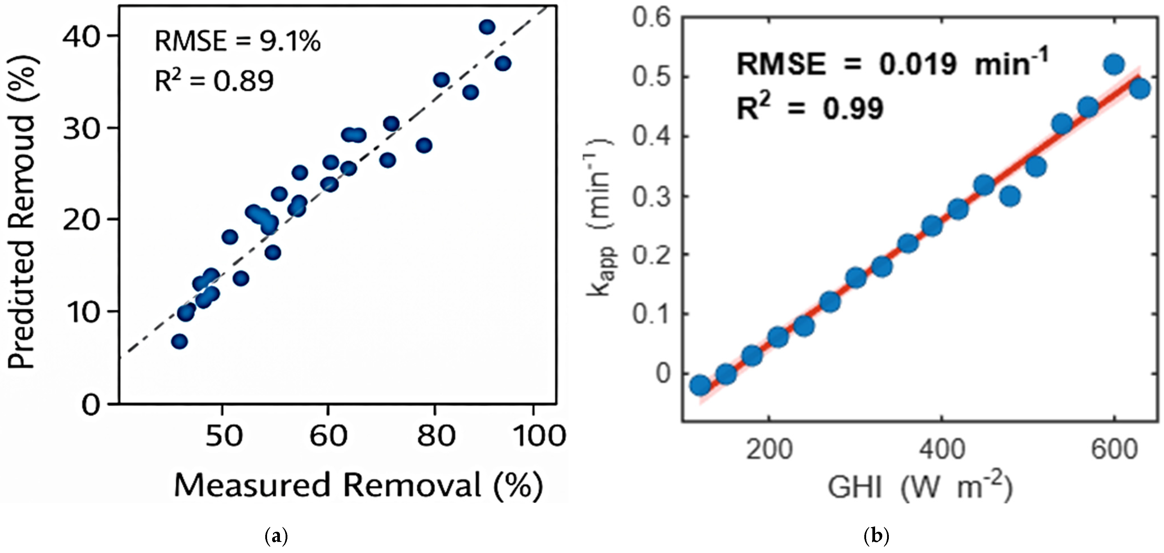 Figure 3 evaluates the predictive performance of the developed model and the dependence of photocatalytic kinetics on solar input. Panel (a) shows strong agreement between measured and predicted pollutant removal, with low error (RMSE = 9.1%) and high explanatory power (R