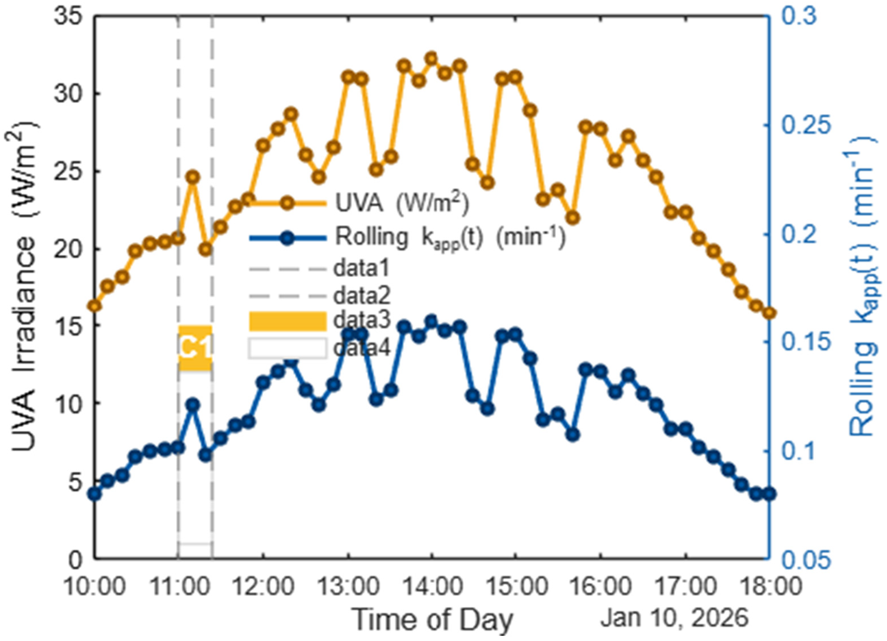 Figure 4 shows the diurnal variation in measured UVA irradiance and the corresponding rolling apparent rate constant (k_app) during outdoor operation of the TiO
