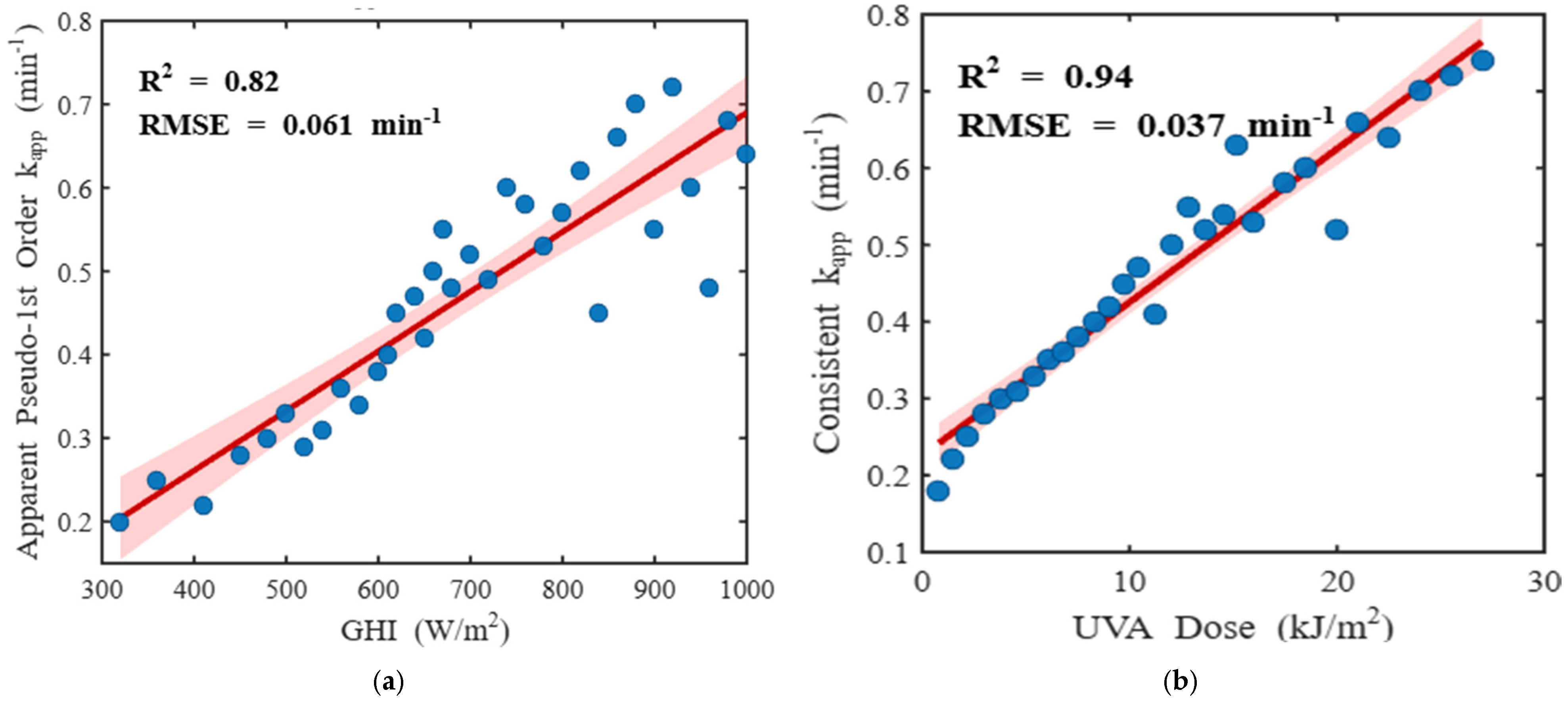 Figure 5 compares the relationship between apparent pseudo-first-order rate constants and global horizontal irradiance (GHI) versus cumulative UVA dose. The stronger correlation and lower error in the UVA dose model demonstrate that spectrally relevant photon dose provides a more reliable basis for predicting photocatalytic kinetics under natural sunlight.