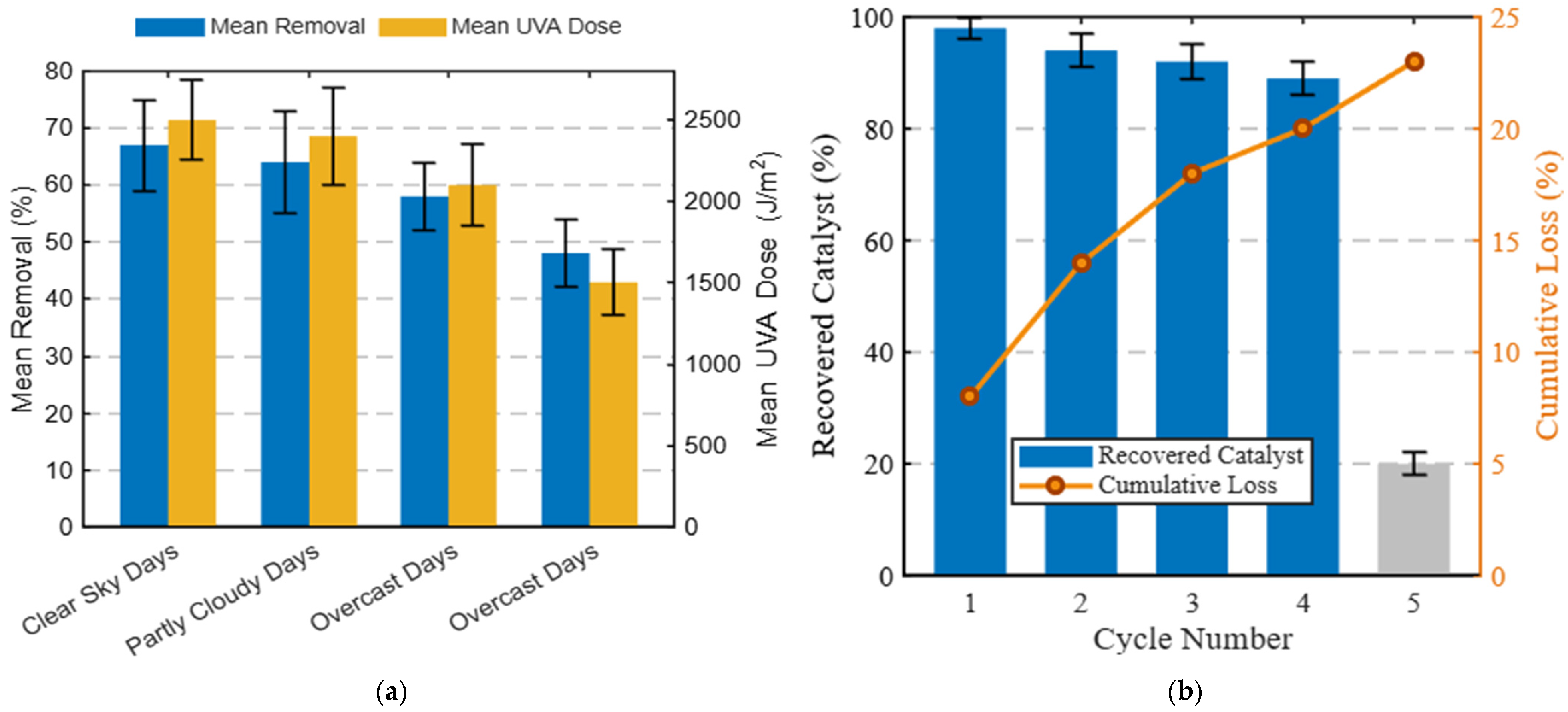 Figure 6a shows that mean pollutant removal closely followed the mean UVA dose across clear, partly cloudy, and overcast conditions. This confirms the dependence of treatment efficiency on photon availability. Panel (b) illustrates the progressive but moderate decline in recovered catalyst activity over reuse cycles, with cumulative loss remaining limited. This shows acceptable catalyst stability for practical operation.