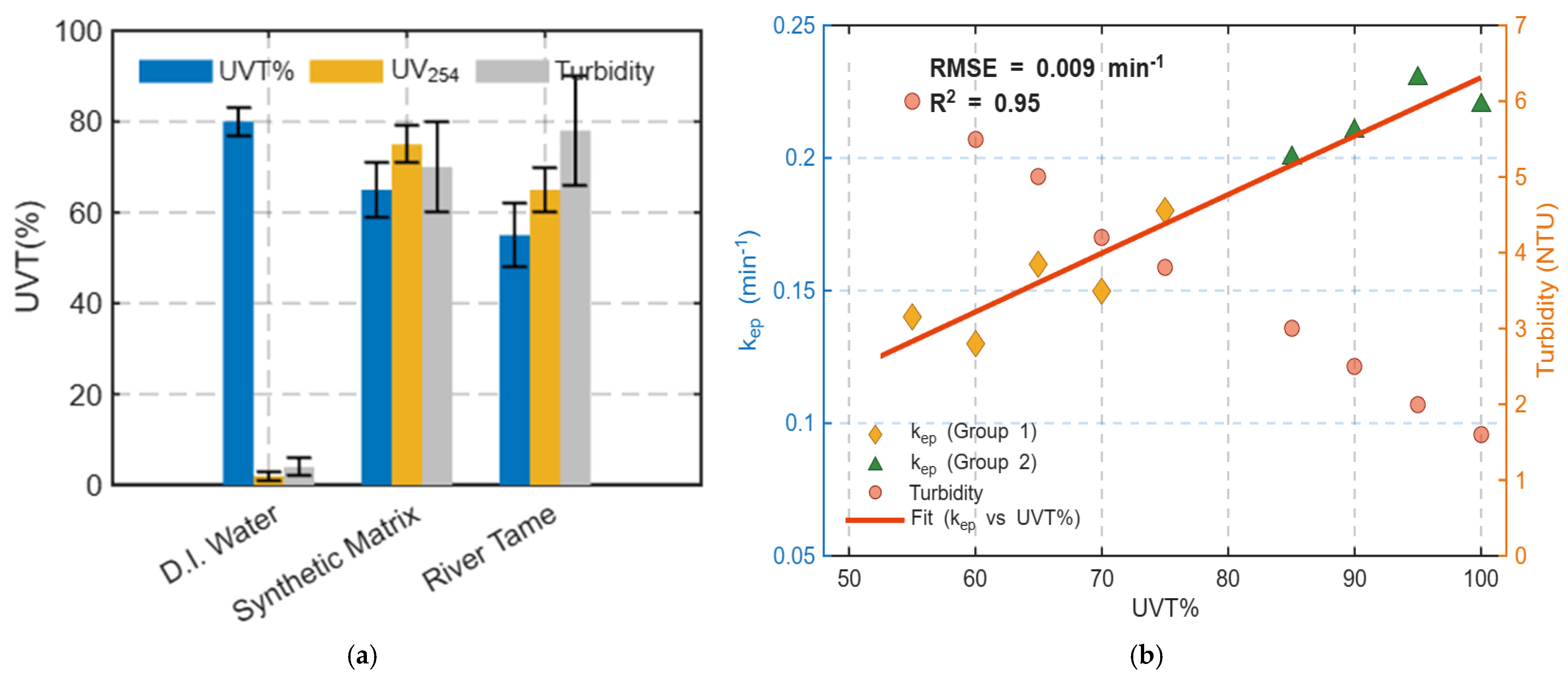 Figure 7a compares UV transmittance (UVT%), UV254 absorbance, and turbidity for deionised water, a synthetic matrix, and river water, which can highlight the increasing optical attenuation in real-water samples. Panel (b) shows that higher UVT% is associated with higher apparent rate constants (k_app), which confirm that light screening by natural organic matter and turbidity is a key determinant of photocatalytic performance.