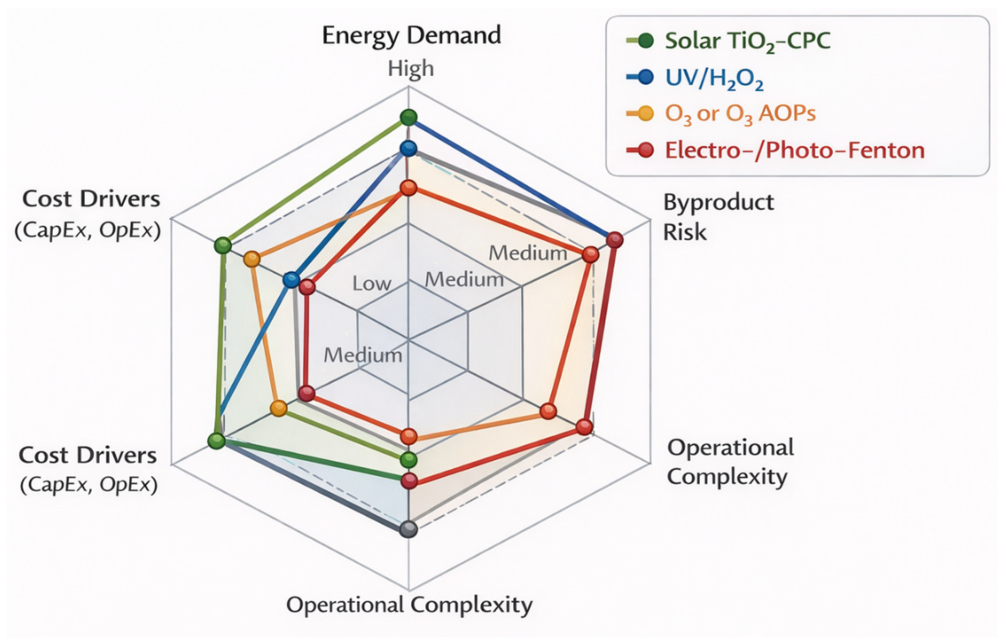 When evaluated within a broader advanced oxidation context, the TiO2–CPC system displayed a distinctive performance profile. It offered clear advantages, which include low external energy demand and minimal chemical inputs. Its primary limitation remained environmental dependence, as performance was constrained by solar availability and water clarity. In contrast, electrically driven AOPs such as UV/H2O2 or ozonation provide more stable performance, but incur substantially higher operational costs and infrastructure complexity.