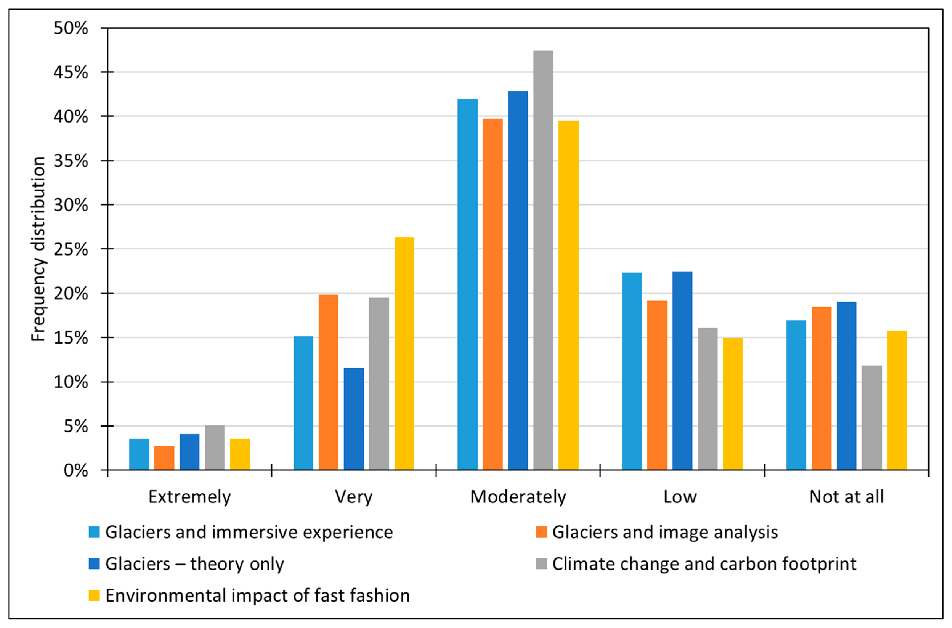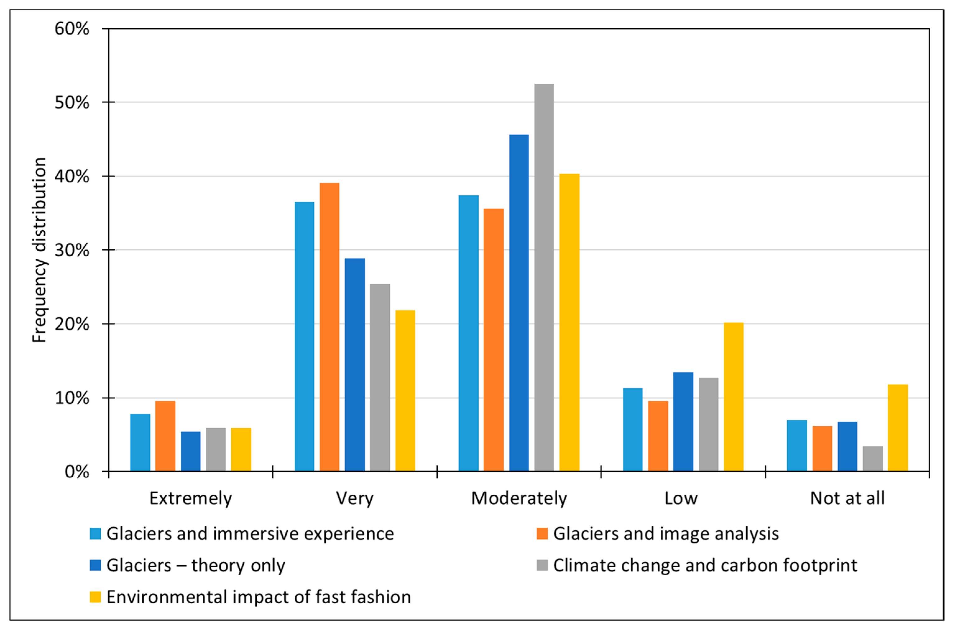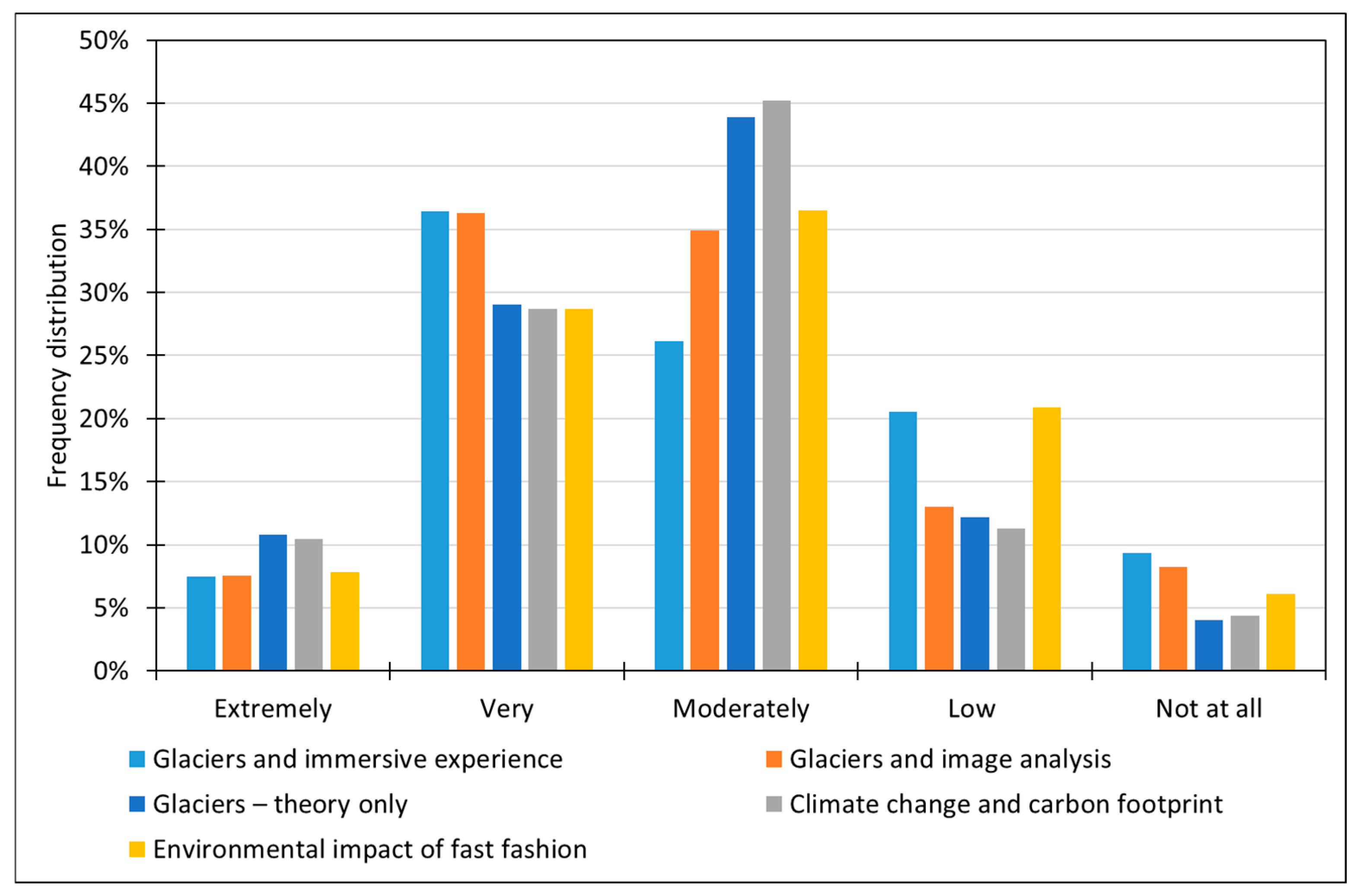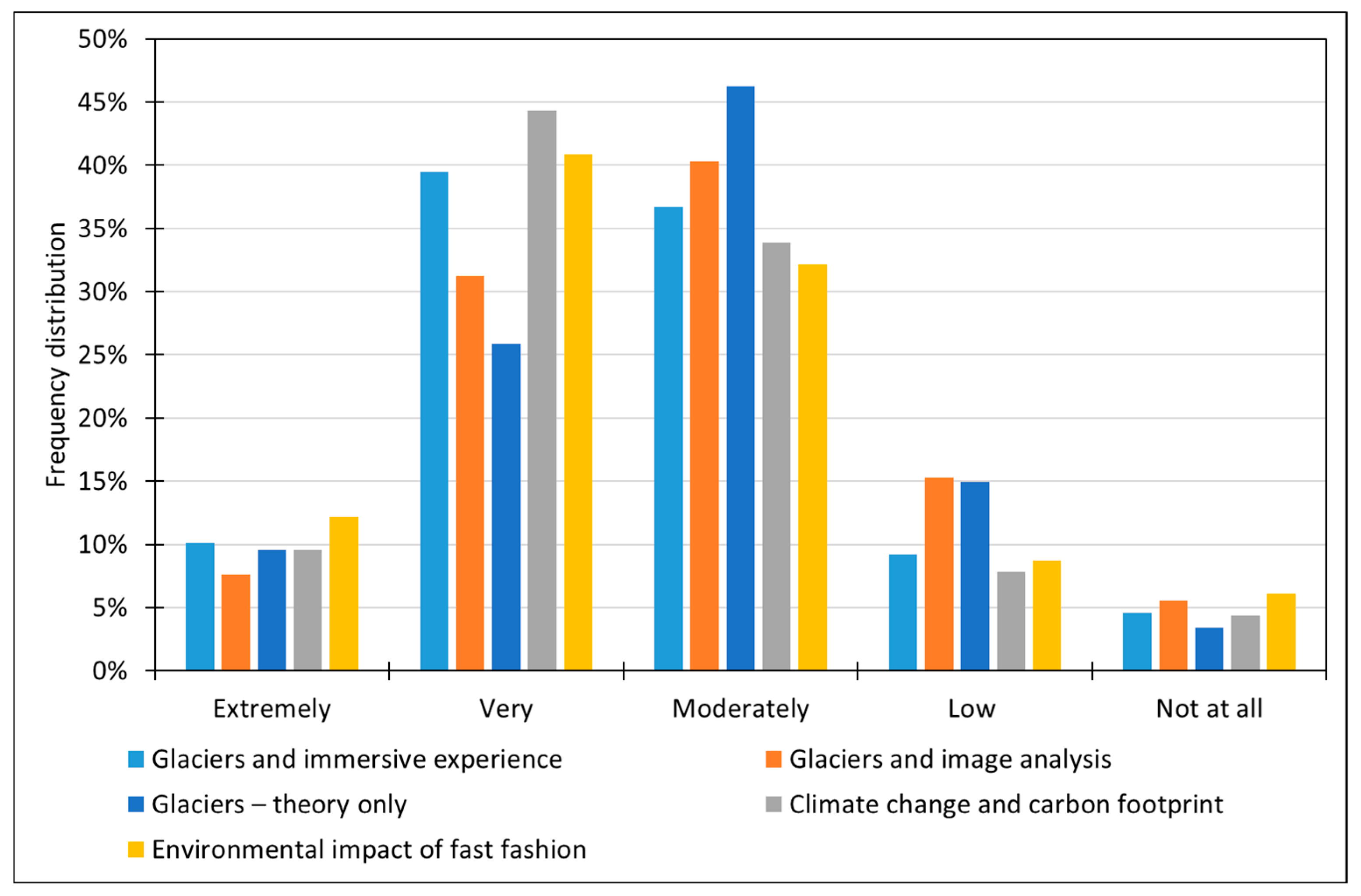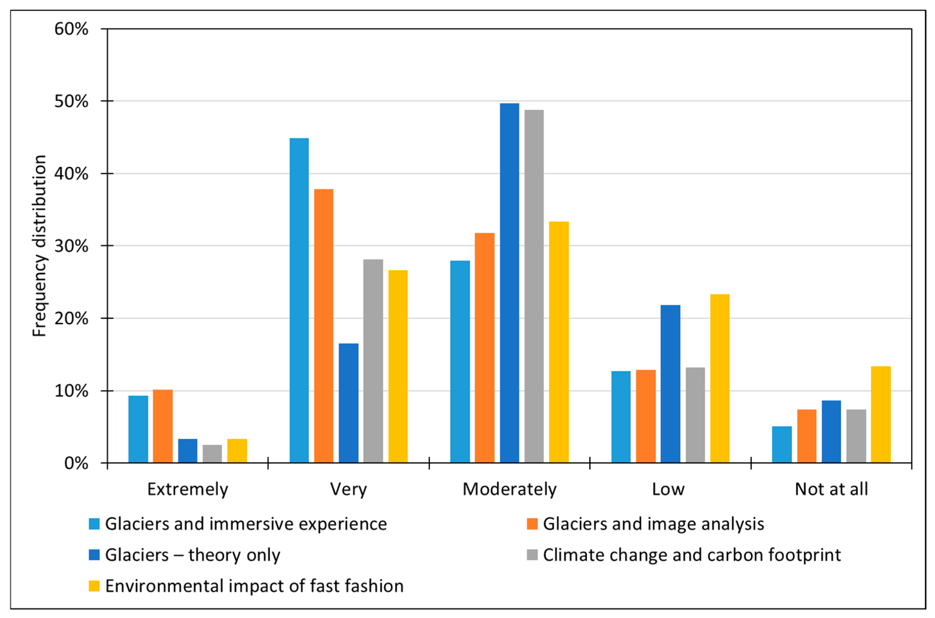When focusing on the “Extremely” category, the highest proportions were observed for the “Glaciers and image analysis” (10%) and “Glaciers and immersive experience” (8%) modules.