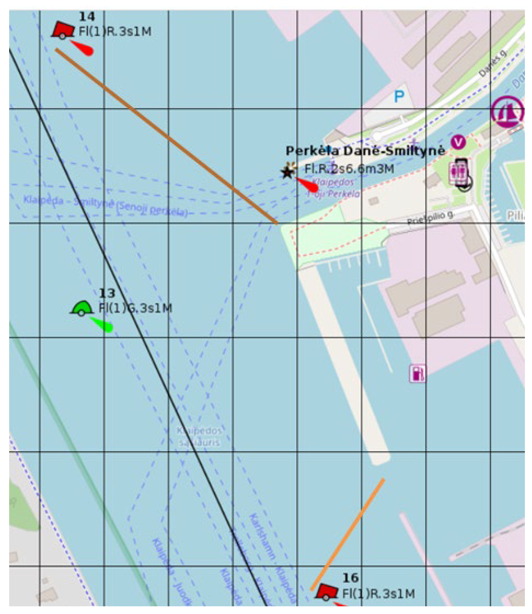 The real ship’s approach to the port, maneuvering in it, mooring and sailing from the quay and sailing from the port were carried out in a southwesterly wind with a speed of about 12 m/s, and the current in the channel direction towards the port gate reached up to 0.5 knots. The same external conditions were used in the calibrated simulator. The simulator was also used to collect statistical data.