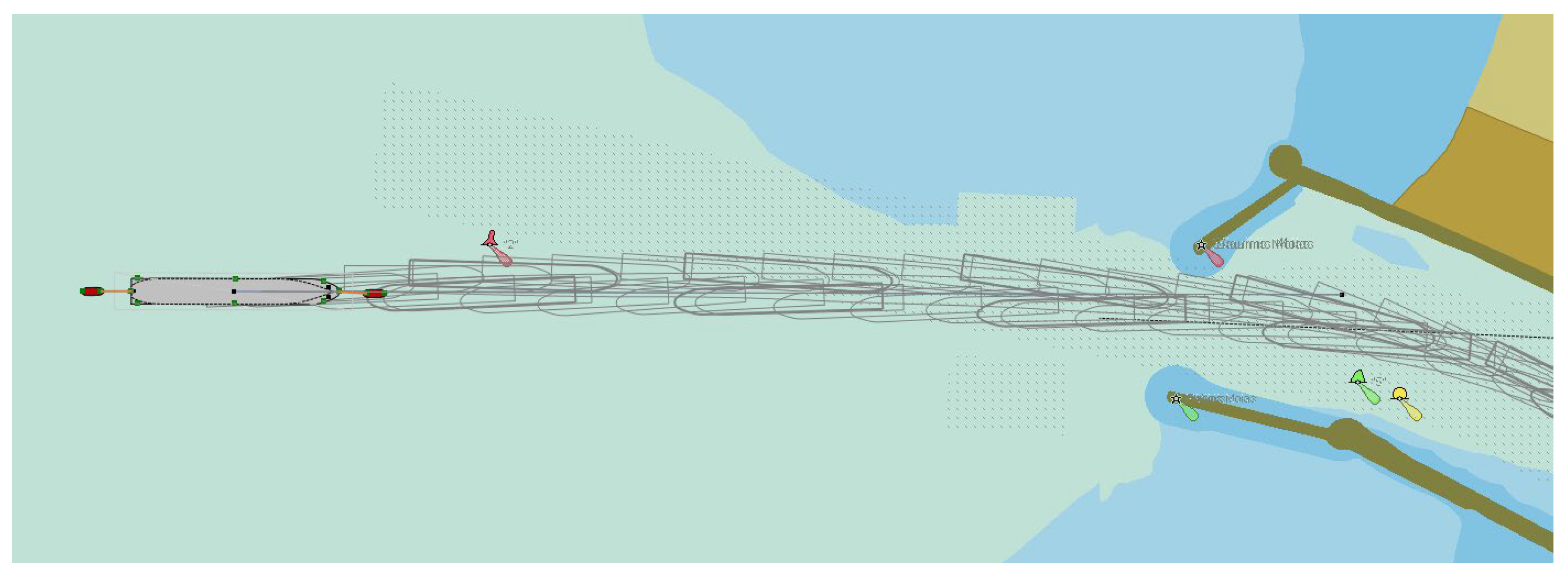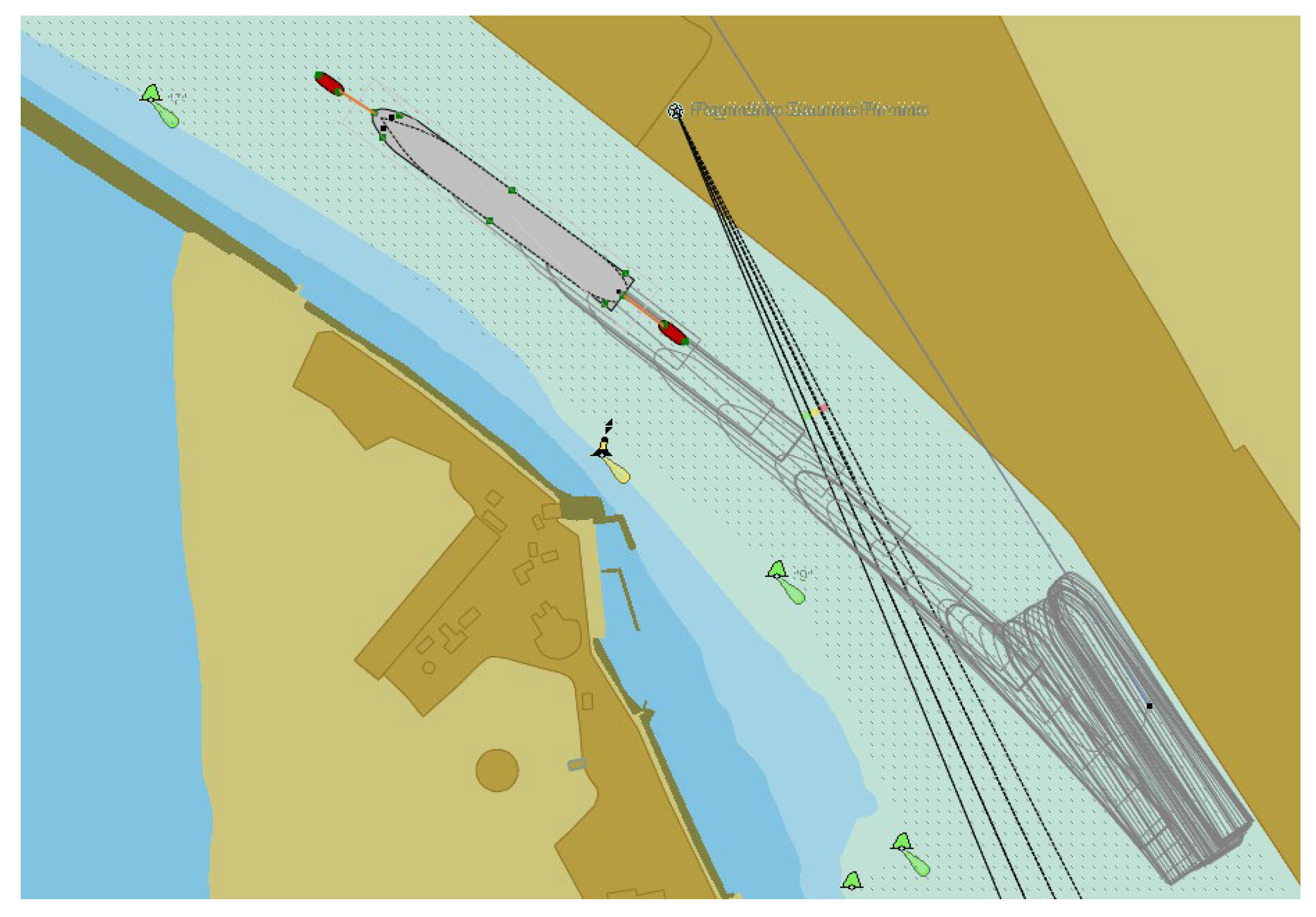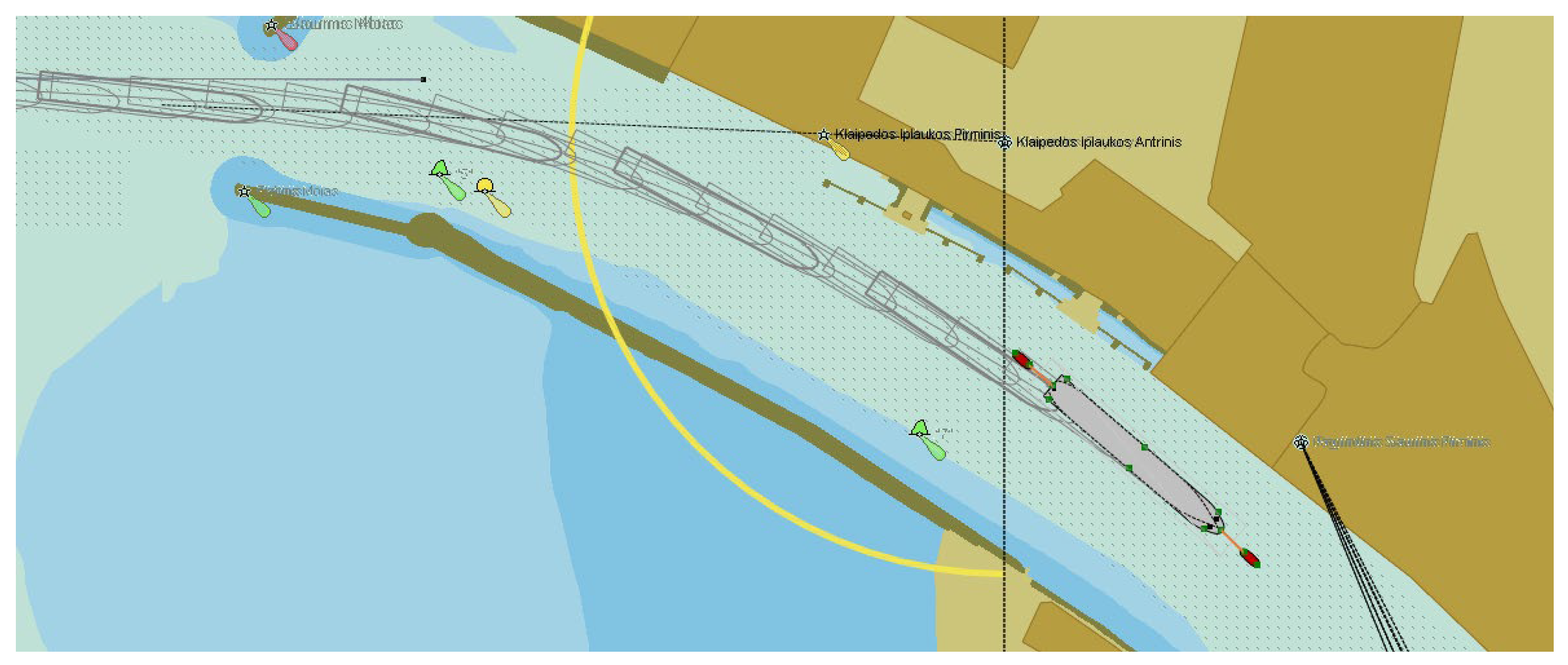 The width of the inner navigation channels is also important due to possible additional effects, such as hydrodynamic effects between the ship and the quay walls or channel slopes, when ships pass ships moored at the quays, etc. Ship navigation lanes in the inner navigation channel, as an example, are shown in