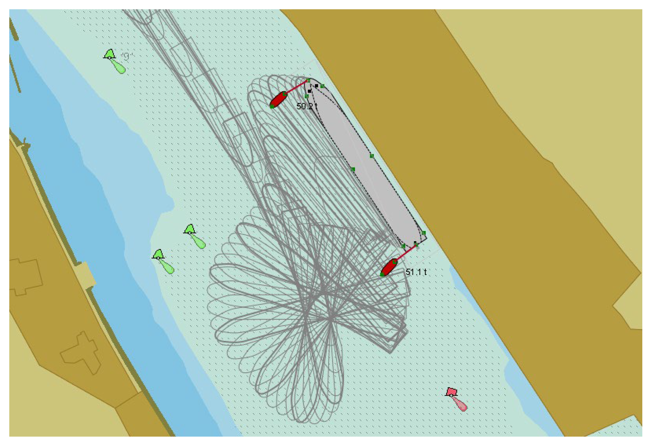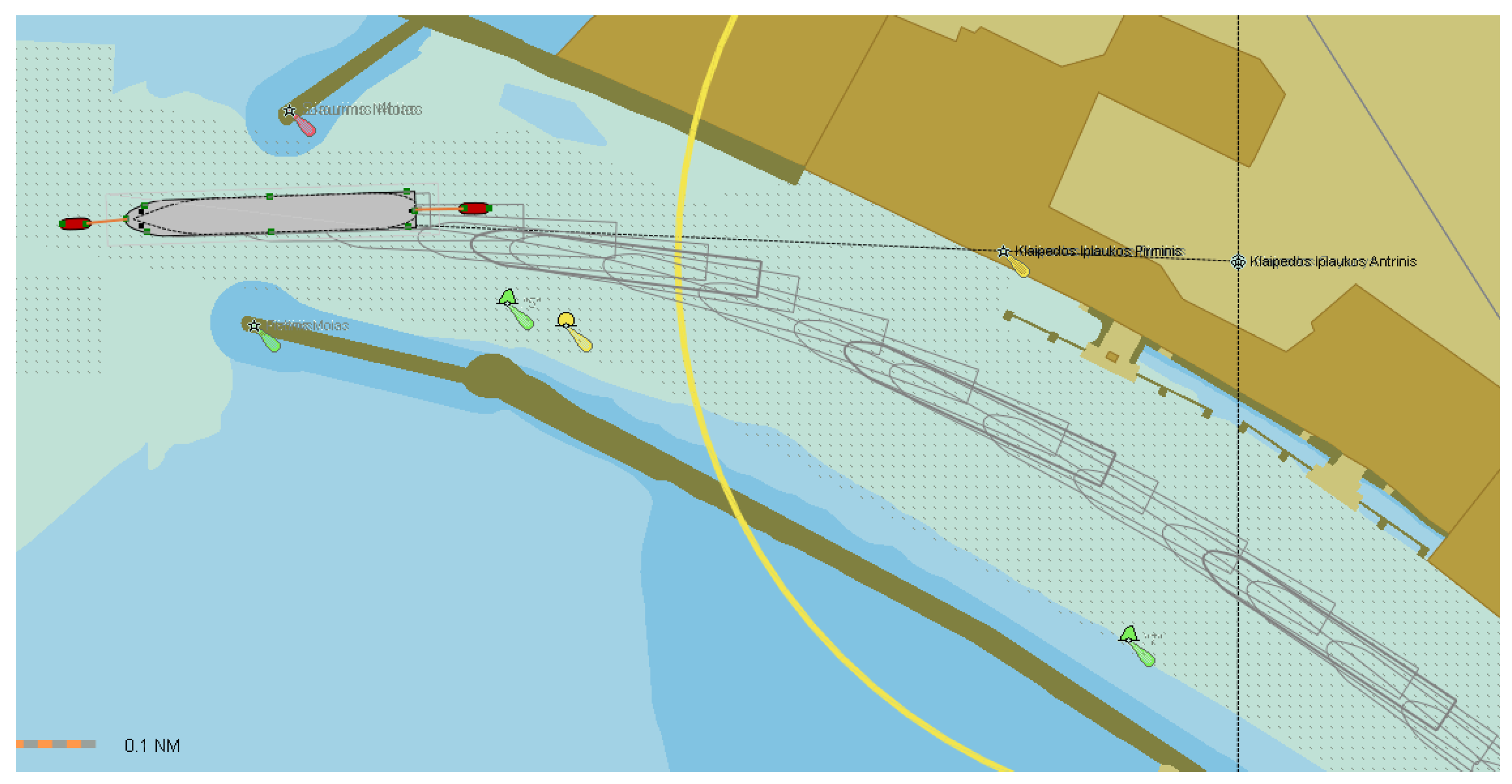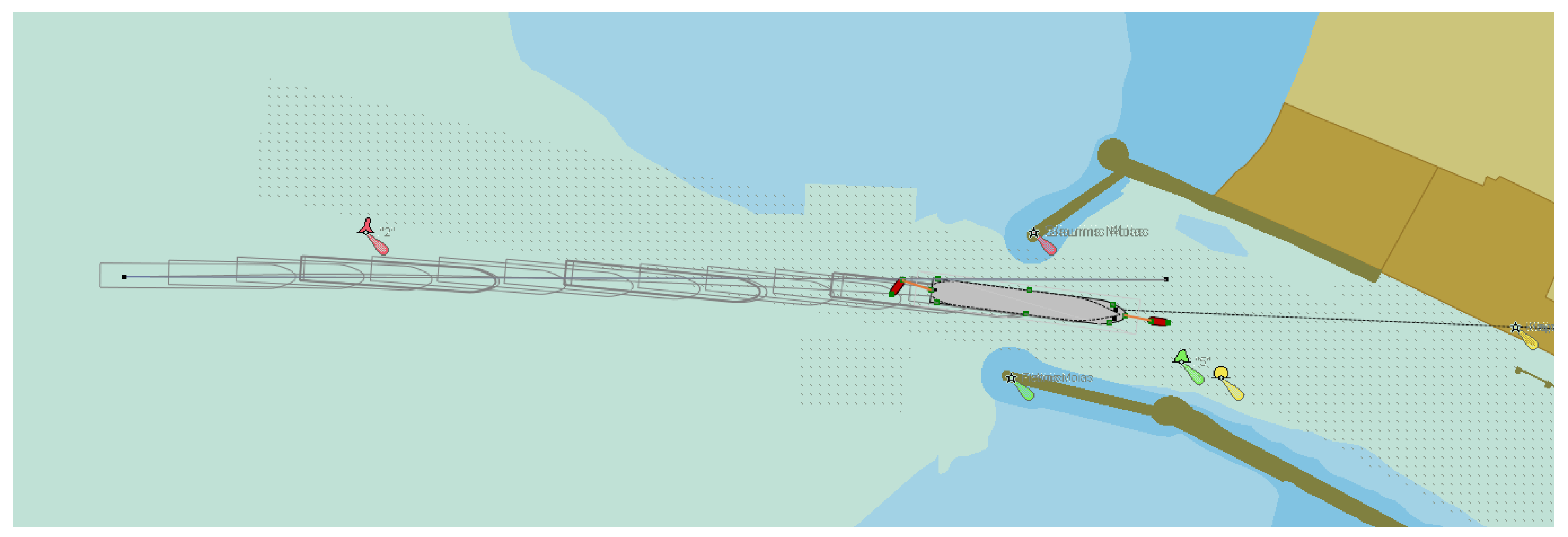 The width of the inner navigation channels is also important due to possible additional effects, such as hydrodynamic effects between the ship and the quay walls or channel slopes, when ships pass ships moored at the quays, etc. Ship navigation lanes in the inner navigation channel, as an example, are shown in
