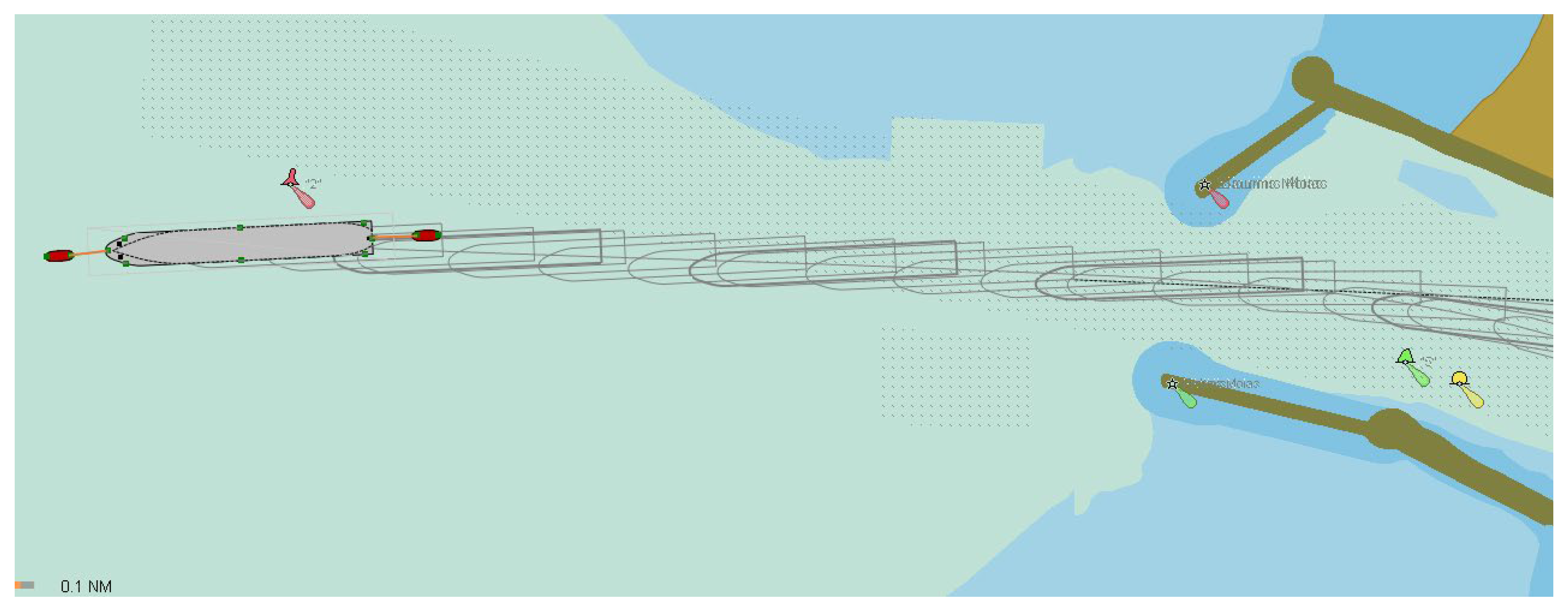 Figure 11 shows the movement lane of a ship as it approaches the quay. The same conditions apply when the ship is being driven away from the quay (