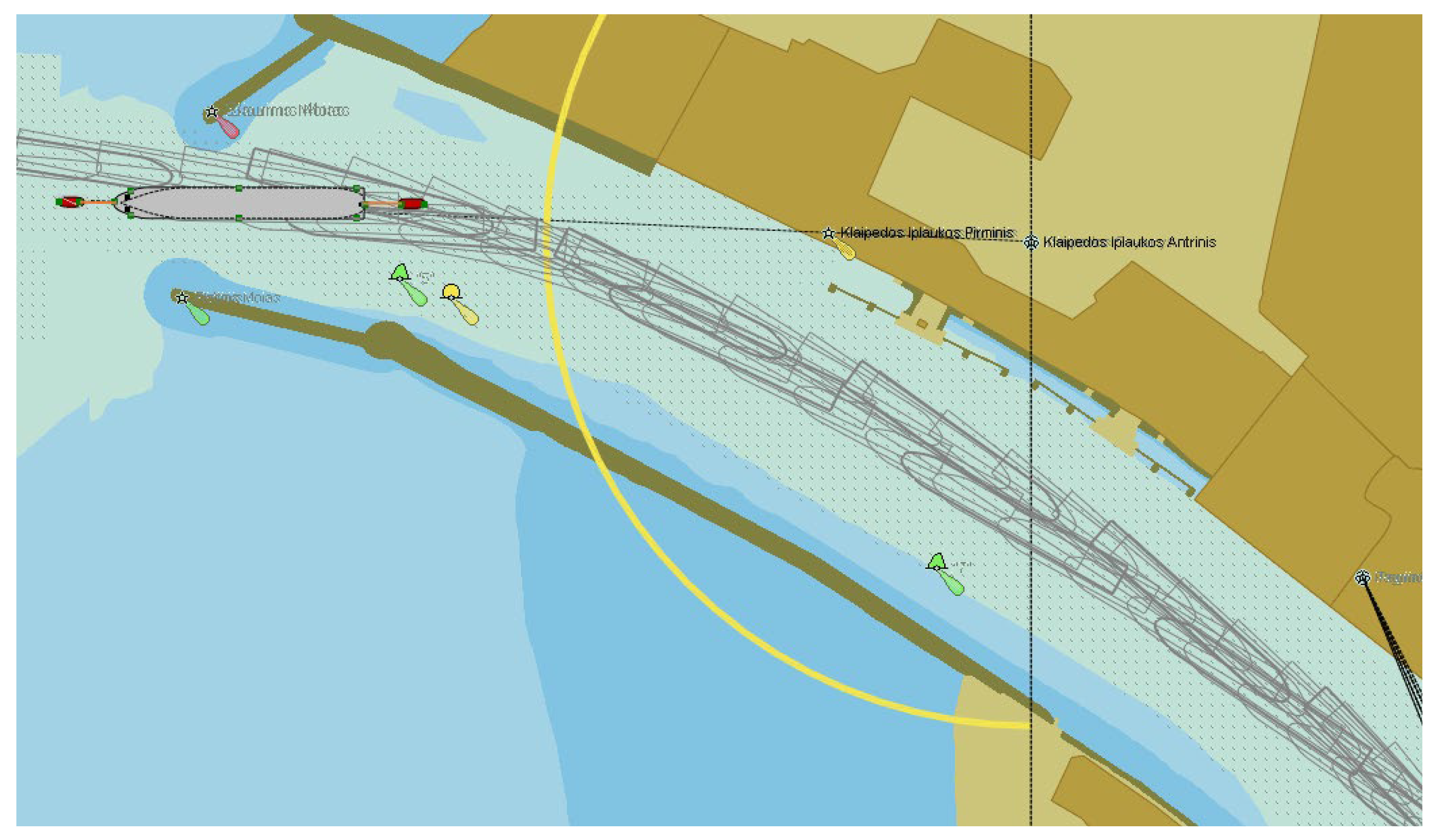 The port entrance channel is very important for achieving a sustainable port; therefore its parameters must ensure not only the navigation safety of incoming and outgoing ships, but also its configuration is important, allowing ships to navigate easily without additional special ship maneuvers. Examples of ship navigation lanes when a ship navigates through the port entrance channel, entering the port and leaving the port are presented in